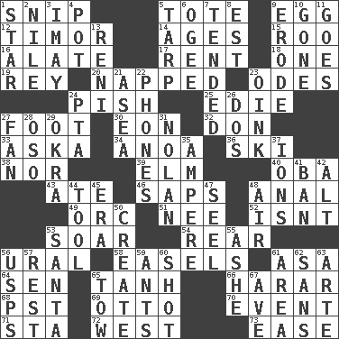 ACROSS 1. Clip 5. Carryall 9. Oval reproductive body of a fowl 12. Southeast Indonesia island 14. Grows older 15. Friend of Pooh 16. Having winglike extensions 17. Monthly bill 18. Single 19. Marina Del _, California 20. Slept 23. Lyric poems 24. Expression of disdain 25. Singer Brickell 27. Lowest support of a structure 30. A really long time 32. Spanish title 33. "____ silly question..." 34. Small Philippine buffalo 36. What Jean-Claude Killy likes to do 38. And not 39. Shade tree 40. Chief or king in Benin or Nigeria 43. Had dinner 46. Plant excrements 48. Of or related to the anus 49. The grampus (Milton) 51. Born 52. Is not 53. Fly high 54. Posterior 56. Mountain range 58. Artist's stands 61. White ___ sheet 64. Elected rep. 65. Hyperbolic tangent 66. Ethiopian city, capital of Harari 68. Pacific Standard Time (abbr.) 69. Von Bismarck 70. Happening 71. R.R. building 72. Compass direction 73. Relaxation DOWN 1. Play the lead 2. Mediterranean tributary 3. "If ____ say so..." 4. Cooking vessel 5. Canvas cover 6. Double curve, resembling the letter S 7. Watched over 8. Eastern Standard Time (abbr.) 9. Eat (away) 10. Went 11. Travels 13. Painter Guido (1575-1642) 21. Toward the sea 22. Gives a jingle 23. Pig sound 24. Parent Teacher Assoc. 26. Two (Sp.) 27. Avid follower 28. Bear (Spanish) 29. Gumbo ingredient 31. Pitcher Ryan 35. Electrical Unit 37. Charged particles 41. Bar 42. The first octave above the treble staff 44. Implement 45. Period 47. Sew up the eyelids of hawks and falcons 48. Wind 50. Make 53. Before Barbara or Clara 55. American tennis player Robert 56. United States Postal Service (abbr.) 57. Repose 59. Pismires 60. Guess 61. Length times width 62. Without 63. Johnson of "Laugh-In" 65. Pull behind 67. "___ Maria"