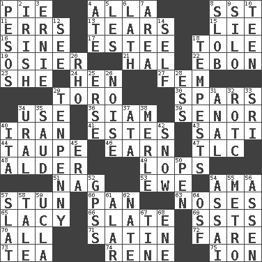 ACROSS 1. Sliced dessert 4. Silent film actress Nazimova 8. Fast jet (abbr.) 11. Blunders 13. Rends 15. Falsehood 16. Trig term 17. First name in cosmetics 18. Lacquered or enameled metalware 19. Flexible twig of a willow tree 21. Actor Linden 22. Inky black, to poets 23. A female animal or person 24. Layer 27. Opposite of masc. 29. "Corrida" creature 30. Practice fights 34. Purpose 36. Thailand, formerly 39. Sir (Sp.) 40. SW Asia republic 41. _____ Park, CO 43. Suttee (variant) 44. Grayish beige 46. Merit 47. Affectionate concern, for short 48. Tree or shrub in the Birch family 49. Chops off 51. Tired old horse 53. She-sheep 54. Nanny (var.) 57. Surprise greatly 60. Baking dish 63. Olfactory organs 65. Made of lace 66. Chalkboard 69. Fast planes 70. Everything 71. Smooth fabric 72. Conductor's collection 73. Beverage made from leaves 74. French philosopher Descartes 75. Electrically charged atom DOWN 1. Mexican monetary units 2. From or relating to Ireland 3. Bert's buddy 4. Had dinner 5. French article 6. Thin strip of wood or metal 7. Type of rug 8. Messy guy 9. Grain storage tower 10. Adolescent 12. Perceive with the eye 14. Automatically 18. Storms 20. 17th letter of the Greek alphabet 25. Celtic language 26. Annoying sound 28. Double-curved letter 29. 3-inch nail 31. Of or related to the anus 32. College mil. group 33. _ Lanka 34. Mountain range 35. Saudi Arabian king (1953-1964) 37. "One Day ___ Time" 38. Haggard of country music 40. Call ___ day 42. Frozen precipitation 45. Period 50. Animal enclosure 52. Global Positioning Systems (abbr.) 54. Slender Brazilian palm 55. Paris' subway 56. NE Netherlands city 57. Narrow board 58. Story 59. Southern CA. univ. 61. Having or resembling wings 62. Nathan's nickname 64. Order of Saint Francis (abbr.) 67. Metal container 68. Compass dir.