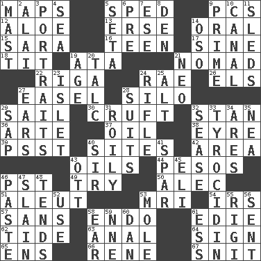 ACROSS 1. Atlas contents 5. Hurried 9. Personal Computers (abbr.) 12. _ vera 13. Celtic language 14. Taken by mouth 15. "Two Mules for Sister ____" 16. Adolescent 17. Trig term 18. Teat (slang) 19. _ moment's notice (2 wds.) 21. Roamer 22. Port city in Latvia 24. Actress Charlotte 26. Raised railways 27. Artist's stand 28. Grain storage tower 29. Move on water 30. An unpleasant substance 32. Comedian Laurel of Laurel & Hardy 36. Johnson of "Laugh-In" 37. Petroleum 38. Jane of fiction 39. Inconspicuous attention getter 40. Settings 42. Type of rug 43. Petroleums 44. Mexican monetary units 46. Pacific Standard Time (abbr.) 49. Attempt 50. Actor Baldwin 51. Eskimo relative 53. Medical imaging device (abbr.) 54. Big collection agency 57. Without 58. Inside; within (prefix) 61. Singer Brickell 62. Periodic rise and fall of the sea level 63. Of or related to the anus 64. Public display of a written message 65. Followers of ems 66. French philosopher Descartes 67. In a ____ (agitated or irritated) DOWN 1. Vertical spar for supporting sails 2. Jai ____ 3. Likenesses of persons 4. Ocean 5. Stalk of a moss capsule 6. Before (prefix) 7. Compass dir. 8. Lair 9. A-one 10. Lessep's creation 11. Bobsleighs 14. Bear (Spanish) 19. Ripen 20. Baby powder 21. Modern: prefix 23. Small island 24. Firearm 25. Keyboard modifier key 27. Hearing organs 28. Sets or collections 29. Plant excrement 31. Turbulent 32. Gospel singer Marvin 33. Polypeptide antibiotic 34. Ancient Greek god of war 35. Teachers' org. 40. Title for a knight 41. Practice fight 43. Baseball player Mel 45. Biblical high priest 46. Thick mixture 47. Killed 48. Is inclined (to) 52. Purpose 53. Undercover agent 55. Swiss mountan, "Queen of the Mountains" 56. Emitted 58. Hearing organ 59. Compass dir. 60. Daniel's nick name 61. Curvy letter