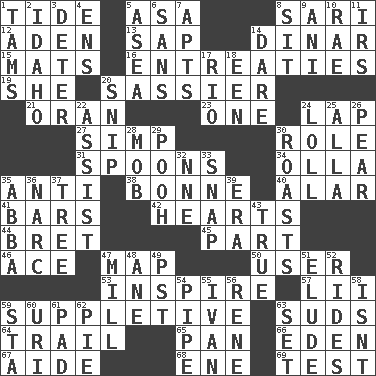 ACROSS 1. Periodic rise and fall of the sea level 5. White ___ sheet 8. Indian skirt 12. Arabian gulf 13. Plant excrement 14. Middle Eastern gold or silver currency 15. Floor protectors 16. Pleas 19. A female animal or person 20. More disrespectful 21. Northwest Algerian city 23. Single 24. Pet locale 27. Simple or foolish person 30. Hero or heavy, e.g. 31. Soup utensils 34. Spanish pot 35. Opposed to 38. Child's nurse 40. Having or resembling wings 41. Oblong pieces of solid material 42. Centers of feelings and intuitions 44. Cy Young winner Saberhagen 45. Piece 46. Adept person 47. Atlas unit 50. One who makes use of a thing 53. Heighten or intensify 57. Cards in a Roman deck? 59. Supplementary 63. Beer foam 64. Hang back 65. Baking dish 66. Locale of original sin 67. Assistant 68. Compass dir. 69. Trial DOWN 1. Scottish caps 2. Potato state 3. Prevent from occurring 4. Followers of ems 5. Toward the sea 6. Without 7. Tenement units (abbr.) 8. Be seated 9. Black tropical American cuckoo 10. Actress Charlotte 11. Big collection agency 14. Have the gumption 17. River (Sp.) 18. Car or cant ending 20. Clip 22. Aid 24. Hang loosely or laxly 25. Silent film actress Nazimova 26. Lightbulb-shaped fruit 28. Disorderly crowd 29. "Silly old bear" 30. Cooks with dry heat, as in an oven 32. Compass dir. 33. Fastener 35. Swedish rock group 36. Drug cop 37. Family _ (genealogy) 39. Period 43. Loyal 47. Place where flour is made 48. A saturated hydrocarbon 49. Pacific Standard Time (abbr.) 51. Evade 52. Amusement-park features 54. Corncob 55. _ the terrible 56. French philosopher Descartes 58. Is not 59. R.R. building 60. RI univ. 61. Writing tablet 62. Sliced dessert 63. Arrange properly for use