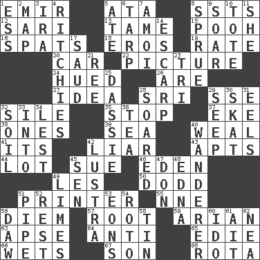 ACROSS 1. Independent ruler or chieftain 5. _ moment's notice (2 wds.) 8. Fast planes 12. Indian skirt 13. Not wild 15. "Silly old bear" 16. Arguments over trivial matters 18. Greek god of love 19. Assign a rank or rating to 20. Auto 22. Photo 24. Took on color 26. "We ___ not amused" (Victoria) 27. The main thing one is thinking about 28. _ Lanka 29. Compass dir. 32. Filth; sediment 35. Discontinue 37. Supplement with great effort 38. Washington bills 39. Ocean 40. Welt 41. It is 42. One who doesn't tell the truth 43. Tenement units (abbr.) 44. Car dealer's back yard 45. Take to court 46. Paradise 49. French article 50. Texas town _ City 51. Hard copy producer 55. Compass dir. 56. South Vietnam president (1954) 57. Carrot, for example 59. Believer in; advocate of (suffix) 63. Domed church section 64. Opposed to 65. Singer Brickell 66. Moistens 67. Male child 68. Round or rotation of duties DOWN 1. Curvy letter 2. Atlas unit 3. Lyricist Gershwin 4. Actors Guy, Robert Welles, and Clint 5. Had dinner 6. Canvas cover 7. Mine, in Marseilles 8. Upset 9. Fly high 10. Carryall 11. A female animal or person 14. Fortification 17. Saudi Arabian king (1953-1964) 21. To sift 23. Three (prefix) 25. Small ungulate mammals of Africa 28. Flew 29. Ooze 30. Three-handed card game 31. Snakelike fish 32. Land 33. To the inside or interior of 34. For fear that 36. Beverage made from leaves 40. Nomad 42. A period of five years 45. Elected rep. 47. Spanish title 48. Pulitzer Prize-winning author Ferber 49. Citrus fruits 51. Corncob 52. Take ten 53. Immeasurably long periods of time 54. Printing process, for short 56. Obsolete 58. Shallow baking pan 60. Wedding promise 61. Small island 62. Teachers' org.