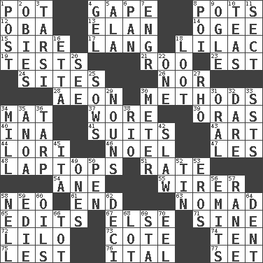 ACROSS 1. Cooking vessel 4. Open wide 8. Plant holders 12. Chief or king in Benin or Nigeria 13. Style 14. Double curve, resembling the letter S 15. Beget 17. Austrian-born American filmmaker Fritz 18. Pale purple color 19. Trials 21. Friend of Pooh 23. Eastern Standard Time (abbr.) 24. Locates 26. And not 28. Period of immesurable duration 30. Modes 34. Floor covering 37. Had on 39. Mouths or openings 40. _ tizzy (2 wds.) 41. Sets or collections 43. Tate display 44. Australian parrot (variant) 46. Christmas carol 47. French article 48. Portable computers 51. Pace 54. One (Scot) 55. One who wires 58. Modern: prefix 61. Conclusion 63. Roamer 65. Proofreads 67. Otherwise 71. Trig term 72. _ and Stitch 73. ____ d'Azur (French Riviera) 74. Nine, plus one 75. For fear that 76. Slanted text style (abbr.) 77. Arrange properly for use DOWN 1. Mail 2. Off-Broadway awards 3. Tarsus (plural) 4. Set 5. Chicken ___ king 6. Baking dish 7. Engineer (abbr.) 8. Luau course 9. Stare at amorously 10. Afternoon social gatherings 11. Religious group 16. Singer James 18. Plunder 20. Perceive with the eye 22. Single 25. Sty mamas 27. 17th letter of the Greek alphabet 29. Parts of speech 30. Distance measurement 31. Taken by mouth 32. Have the gumption 33. Fast planes 34. Place where flour is made 35. Small Philippine buffalo 36. Canvas cover 38. _ de Janeiro 42. Cole _ (cabbage dish) 45. Call ___ day 49. Washington bills 50. Fenced enclosure 52. Metal container 53. Greek god of love 56. Gives off 57. The wife of a rajah (variant) 58. 1994 drama film starring Jodie Foster 59. Singer Brickell 60. Petroleums 62. Tenth: prefix 64. Undesirable depression on a surface 66. Small child 68. Car dealer's back yard 69. R.R. building 70. Snakelike fish