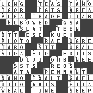 ACROSS 1. Having great length 5. Afternoon social gatherings 9. Papal veil 13. Russian composer Stravinsky 14. Armor plate that protects the chest 15. Type of rug 16. Entreaty 17. Swap 18. One who doesn't tell the truth 19. Shoved, as through a crowd 21. Girls' org. (abbr.) 22. Narrow board 23. Adolescent 24. Baseball player Mel 27. Compass dir. 28. Malaysian steamed pastry 29. Picture 31. Actress Charlotte 32. Legendary monster 36. Pacific island yam 37. Be seated 38. Taken by mouth 39. Portico 40. Environmental prefix 41. Prepares for publication 42. "You Light Up My Life" star Conn 44. Globe 46. Born 47. Fast planes 48. Vintage cars 50. _ moment's notice (2 wds.) 51. Pre-World Series prize 54. Billionth: prefix 56. Honor 58. Highlander 60. "Beetle Bailey" pooch 61. Opinion 62. Singer James 63. Welt 64. Prong on a fork 65. Ooze DOWN 1. Mouth edge 2. Stare at amorously 3. Christmas carol 4. Seizes 5. Cylindrical with tapered ends 6. Mild oath 7. Help 8. Compass dir. 9. It jiggles the polygraph 10. Believer in; advocate of (suffix) 11. Teachers' org. 12. Rowing implement 17. It was, poetically 20. Butter sub 21. Turn to the right 23. Third day of the wk. 24. Chooses 25. Not this but _ 26. "Corrida" creature 28. Krazy ___ of comics 30. Inedible or poisonous agaric 31. _ de Janeiro 33. Broad smile 34. Assign a rank or rating to 35. Otherwise 37. _-fi 40. Begley and Asner 41. Inky black, to poets 43. Call ___ day 44. Threatening words 45. Monthly bill 47. Before Barbara or Clara 49. Gurus 51. Ache 52. Nathan's nickname 53. False hair 54. Immediately 55. Had dinner 56. Consume 57. 16 59. Pet locale