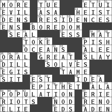 ACROSS 1. Greater amount 5. Third day of the wk. 8. Needle case 12. Tending to cause great harm 13. White ___ sheet 14. Robbery 15. Cub Scout units 16. Homes 19. Followers of ems 20. Mood resulting from idleness 21. Lick closed 23. Curvy letter 24. Floor protector 27. Puff or smoke 30. Expression of disdain 31. Seas 34. Toward shelter 35. Relating to the mouth 38. Relatively large 40. Kill 41. Deli pickle 42. Finds the solution 44. Armor plate that protects the chest 45. Docile 46. Be seated 47. Eastern Standard Time (abbr.) 50. The content of cognition 53. Curse 57. Chicken ___ king 59. Census information 63. 4th largest of the Great Lakes 64. Debaucheries 65. Lower and raise head in agreement 66. Western Nevada city 67. Writer Wiesel 68. Begley and Asner 69. An important port of Yemen DOWN 1. Ancient Persian 2. Baking chambers 3. Remove soap 4. Raised railways 5. Pacific island yam 6. One who uses or employs something 7. Comfort 8. Car or cant ending 9. Nervous spasm 10. Purpose 11. It is 14. Cloth borders 17. Binary compound 18. Two (Sp.) 20. Group of countries in special alliance 22. Ringlike coral islands and reefs 24. Place where flour is made 25. Toward the sea 26. Those people 28. Cask 29. Hearing organs 30. Went by 32. Modern: prefix 33. Table seasoning 35. Lyric poems 36. Swiss mountan, "Queen of the Mountains" 37. Set down 39. Federal power corp. 43. Send forth 47. Snakelike fish 48. Health resort 49. Teat (slang) 51. Having ears or earlike features 52. Place in a line 54. Prong on a fork 55. Parka part 56. Extremities 58. Period of immesurable duration 59. Before (prefix) 60. Lubricate 61. Luau course 62. Shoshoni 63. Epoch