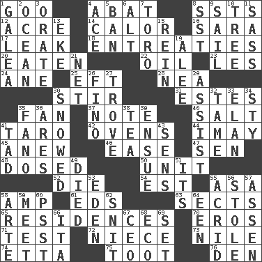 ACROSS 1. Thick or sticky substance 4. Blind as ____ 8. Fast planes 12. Measure of real estate 14. Bodily heat indicating an inflammation 16. "Two Mules for Sister ____" 17. Path through which fluid escapes 18. Pleas 20. Eroded 22. Petroleum 23. French article 24. One (Scot) 25. Bank Draft (abbr.) 28. Teachers' org. 30. Tumult 31. _____ Park, CO 35. Avid follower 37. Make mention of 40. Table seasoning 41. Edible starchy tuberous root 42. Baking chambers 44. "If ____ say so..." 45. Afresh 46. Relaxation 47. Elected rep. 48. Administered medicine 50. A single undivided whole 52. Pass on 54. Eastern Standard Time (abbr.) 55. White ___ sheet 58. Electrical Unit 61. Begley and Asner 63. Religious groups 65. Dwellings 70. Greek god of love 71. Trial 72. Sibling's daughter 73. "Death on the ____" 74. Singer James 75. A blast of a horn 76. Lair DOWN 1. An organ shaped like a helmet 2. Sea 3. Speak pompously 4. Adept person 5. Forbid 6. Keyboard modifier key 7. "Corrida" creature 8. Fast jet (abbr.) 9. Travel by water 10. Relationship diagram 11. Backtalk 13. Make supply last 15. It's straight from the horse's mouth 19. Toward shelter 21. Remaining after all deductions 26. A pale, very dry sherry 27. Collection of objects 29. Help 30. Frozen precipiation fell 32. Not wild 33. Style 34. Filthy place 35. Papal veil 36. Ancient Greek god of war 38. Afternoon social gathering 39. Follow as a consequence or result 41. Bit 43. Elected reps. 49. Passed on 51. ___ a Wonderful Life 53. Paradise 55. Sour-tasting 56. Took without asking 57. NE Netherlands city 58. Johnson of "Laugh-In" 59. Confront 60. Inconspicuous attention getter 62. In a ____ (agitated or irritated) 64. Car or cant ending 66. Call ___ day 67. Corporate head (abbr.) 68. Environmental prefix 69. Arrange properly for use