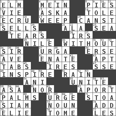 ACROSS 1. Shade tree 4. Chow _ 8. Sliced desserts 12. Compete 13. "____ silly question..." 14. Lacquered or enameled metalware 15. Shade of tan 17. Shed a tear 18. 2nd pers. sing. pres. of can (arch.) 19. Makes a sale 21. According to 23. Ocean 24. Lacerates 26. Big collection agency 28. The longest river in the world 30. Sans 34. Title for a knight 37. Capital and largest city of Mongolia 39. Celtic language 40. "___ Maria" 41. Related on the mother's side 43. Fitting 44. Bar bills 46. Angers 47. Compass dir. 48. Motivate 51. Precipitation 54. Black tropical American cuckoo 55. Join together 58. White ___ sheet 61. And not 63. To the left, to Queeg 65. Insides of hands 67. Goad 71. Portico 72. Thailand, formerly 73. Part of speech 74. Find the sum of 75. Writer Wiesel 76. Heavy book 77. French article DOWN 1. Nights before holidays 2. It is permitted: Lat. 3. Haggard of country music 4. Informal term for the mouth 5. Compass dir. 6. Mamie's mate 7. California wine valley 8. Parent Teacher Assoc. 9. Charged particles 10. Otherwise 11. Stalk of a moss capsule 16. Uhlan (variant) 18. Haul 20. Indian title of respect (Mr.) 22. Cards in a Roman deck? 25. Change direction abruptly 27. A female animal or person 29. Bert's buddy 30. Wetness 31. Mouths or openings 32. United States Postal Service (abbr.) 33. Wig 34. Suttee (variant) 35. "Terrible" tsar 36. Confederate soldiers (slang) 38. Slender fish 42. He sold his birthright 45. Health resort 49. Restaurants 50. _ de Janeiro 52. _ tizzy (2 wds.) 53. Cuts off 56. "_____ Recall" 57. Eat (away) 58. Domed church section 59. Move on water 60. Mountain range southwest of Kyrgyzstan 62. The smallest animal of a litter 64. Small boys 66. Madame (abbr.) 68. Friend of Pooh 69. Chewing product 70. Compass dir.