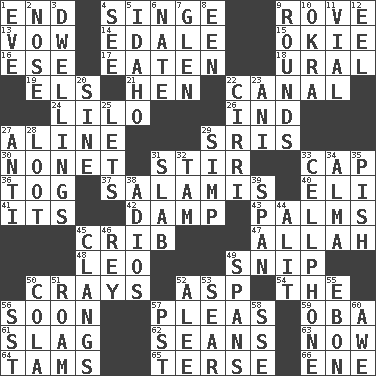 ACROSS 1. Conclude 4. Burn superficially 9. Be footloose 13. Solemn pledge 14. Peak District village in England 15. Migrant worker of the '30s 16. Compass dir. 17. Consumed 18. Mountain range 19. Raised railways 21. Layer 22. Lessep's creation 24. _ and Stitch 26. Working for oneself (abbr.) 27. Place in a line 29. Indian titles of respect 30. Music written for nine 31. Move through with a circular motion 33. Head covering 36. Coat; cloak 37. Deli grouping 40. Connecticut Ivy Leaguer 41. ___ a Wonderful Life 42. Moist 43. Insides of hands 45. Baby bed with high sides 47. Assad's deity 48. Lion 49. Sever or remove by pinching or nipping 50. Trading vessels 52. Viper 54. Definite Article 56. Within a short period 57. Entreaties 59. Chief or king in Benin or Nigeria 61. Volcanic refuse 62. Seines 63. At this time 64. Scottish caps 65. Laconic 66. Compass dir. DOWN 1. First lady 2. Sense of smell 3. Residences 4. Observe 5. Potato state 6. Nathan's nickname 7. Small, secluded valley 8. Car or cant ending 9. Periods in a boxing match 10. Gumbo ingredient 11. Small bottle 12. Snakelike fish 20. Trig term 22. High-altitude cloud 23. Cuckoo 25. Allows 27. Against 28. Plunder 29. Simple or foolish person 31. Broad, flat, thick piece 32. Scottish cap 33. Portable communications device 34. _ mater 35. Expression of disdain 38. Goodbye (Sp.) 39. Connect, as a bridge 44. Set down 45. Rings like a ship's bell 46. Marina Del _, California 49. Connects, as a bridge 50. Root beer relative 51. Wander 52. Toward shelter 53. Dry up 55. Inky black, to poets 56. Fast jet (abbr.) 57. Pacific Standard Time (abbr.) 58. Compass dir. 60. Deep reverence