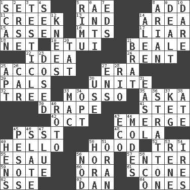 ACROSS 1. Arranges properly for use 5. Actress Charlotte 8. Find the sum of 11. Small stream 13. Working for oneself (abbr.) 14. Type of rug 15. NE Netherlands city 16. Mountains (abbr.) 17. One who doesn't tell the truth 18. Remaining after all deductions 19. Needle case 21. Calif. Air Force Base 22. It may be bright or harebrained 24. Monthly bill 25. Buttonhole 27. Period 29. Friends 30. Join together 32. Woody plant 33. With motion or animation 35. "____ silly question..." 39. Window treatment 41. Proofreading order 42. Sep. follower 43. Develop 45. Inconspicuous attention getter 48. Root beer relative 49. Phone greeting 50. Parka part 52. Three (prefix) 55. He sold his birthright 56. And not 57. Keyboard key 59. Short letter 60. Mouth or opening 61. Biscuitlike quick bread 62. Compass dir. 63. Daniel's nick name 64. Washington bills DOWN 1. Skim 2. Celtic language 3. One of the two male reproductive glands 4. Perceive with the eye 5. Tall New Zealand timber tree 6. Opposed to 7. Begley and Asner 8. Believer in; advocate of (suffix) 9. Started a card game 10. Have the gumption 12. Leg joints 14. Toward shelter 20. Make lace 21. Naughty child 23. Administered medicine 25. Fitting 26. Automobile 27. Followers of ems 28. _ de Janeiro 30. Purpose 31. Artist's stand 33. Apple computer (short form) 34. Elect 36. Ski resort town in Vermont 37. Barrel 38. Had dinner 40. Printing process, for short 43. Environmental prefix 44. Methods 45. Mexican monetary units 46. Chalkboard 47. Turn sharply 49. Coop moms 50. Israeli folk dance 51. Northwest Algerian city 53. French philosopher Descartes 54. Angers 56. Dreamland 58. Non-commissioned officer (abbr.)