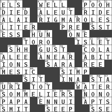 ACROSS 1. Raised railways 4. Not ill 8. "Silly old bear" 12. Passed on 14. Native American of Southwest Alaska 16. Travel on or in a vehicle 17. Jai _ 18. Complicated, petty procedures 20. 61 cubic inches 22. Before (prefix) 23. Fast jet (abbr.) 24. Double-curved letter 25. Attila the _ 28. Single 30. "Corrida" creature 31. Small island 35. Quiet! 37. Abrupt rush of wind 40. Root beer relative 41. Toward shelter 42. Approach 44. "This won't hurt ____!" 45. Charged atoms 46. "Two Mules for Sister ____" 47. To separate or throw off 48. Of or pertaining to a meson 50. Simple or foolish person 52. Be seated 54. _ tizzy (2 wds.) 55. R.R. building 58. RI univ. 61. Small child 63. Wetness 65. Wine waiters 70. Words to Nanette 71. Dad 72. World-weariness 73. Tenement units (abbr.) 74. Stricken, poetically 75. Ooze 76. Compass dir. DOWN 1. Peak District village in England 2. Ms. Damita and namesakes 3. Theater features 4. Armed conflict 5. Biblical high priest 6. Part of a journey 7. Mass 8. Adept person 9. Petroleums 10. Lyric poems 11. Command 13. Pass on 15. Edible starchy tuberous root 19. Painter Guido (1575-1642) 21. 17th letter of the Greek alphabet 26. Capital and largest city of Mongolia 27. Parts of speech 29. Fortification 30. College paper 32. Ear part 33. Writer Wiesel 34. Make lace 35. A type of plum 36. Coop moms 38. Ocean 39. Tarsus (plural) 41. Direct toward a target or goal 43. Water falling in drops from the sky 49. Quote 51. Opening into something insatiable 53. Lacquered or enameled metalware 55. Closes up, plugs up 56. Portable shelters 57. Came up 58. United States Postal Service (abbr.) 59. Wander aimlessly 60. Body of Kaffir warriors 62. Airtight sealed metal containers 64. Santa ___, CA 66. Floor protector 67. Compass dir. 68. Regret 69. Small drink