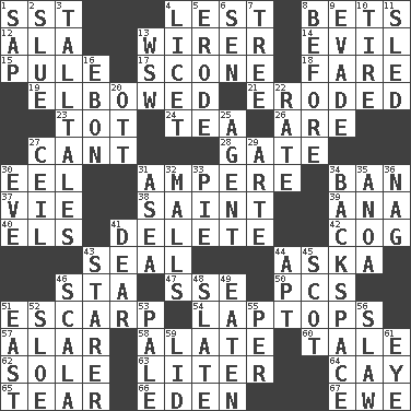 ACROSS 1. Fast jet (abbr.) 4. For fear that 8. Stakes 12. In the manner of 13. One who wires 14. Tending to cause great harm 15. Whimper 17. Biscuitlike quick bread 18. Conductor's collection 19. Shoved, as through a crowd 21. Eaten away 23. Small child 24. Afternoon social gathering 26. "We ___ not amused" (Victoria) 27. Patter 28. Yard entry 30. Snakelike fish 31. Electrical Unit 34. Forbid 37. Compete 38. Virtuous person 39. Santa ___, CA 40. Raised railways 41. Erase 42. Gear tooth 43. Lick closed 44. "____ silly question..." 46. R.R. building 47. Compass dir. 50. Personal Computers (abbr.) 51. Fortification 54. Portable computers 57. Having or resembling wings 58. Having winglike extensions 60. Story 62. Not divided or shared with others 63. 61 cubic inches 64. Island 65. Pull into pieces 66. Locale of original sin 67. She-sheep DOWN 1. Plant excrement 2. Turn sharply 3. Baron Munchausen's specialties 4. It is permitted: Lat. 5. Eat (away) 6. Elected rep. 7. Woody plant 8. Prior to 9. Elude 10. Hoop that covers a wheel 11. Downhill vehicle 13. Compass dir. 16. Inky black, to poets 20. Baseball player Mel 22. Assign a rank or rating to 25. Representative 27. To provide with a ceiling 29. Johnson of "Laugh-In" 30. First lady 31. At sea 32. Promenades 33. Sliced dessert 34. Keyboard key 35. Small Philippine buffalo 36. Tired old horse 41. Letter starter 43. A viewer who gazes fixedly 44. Fitting 45. Highlander 46. Any of the three canals of the cochlea 48. Schedule 49. Eroded 51. Compass direction 52. _ gin 53. Light colored 55. For each 56. Cole _ (cabbage dish) 59. Flaplike covering 61. Sight organ