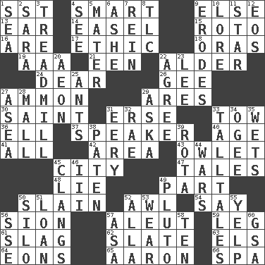 ACROSS 1. Fast jet (abbr.) 4. Don Adams' spy role 9. Otherwise 13. Hearing organ 14. Artist's stand 15. Printing process, for short 16. "We ___ not amused" (Victoria) 17. Moral principle 18. Mouths or openings 19. American Automobile Association (abbr.) 21. Car or cant ending 22. Tree or shrub in the Birch family 24. Letter starter 26. Turn to the right 27. ID or VA city 29. Ancient Greek god of war 30. Inhabitant of Heaven 31. Celtic language 33. Pull behind 36. Pipe bend 37. Orator 40. Personal question 41. 100% 42. Type of rug 43. A small or young owl 45. Municipality 47. Falsehoods 48. Whopper 49. Component 50. Killed 52. Leather borer 54. Declare 56. The Jewish people; Israel 57. Eskimo relative 59. Part of a journey 61. Volcanic refuse 62. Chalkboard 63. Raised railways 64. Immeasurably long periods of time 65. Composer Copland 66. Health resort DOWN 1. Ocean 2. "Two Mules for Sister ____" 3. Excercise machine 4. Perceive with the eye 5. Mother 6. American tennis player Robert 7. It's straight from the horse's mouth 8. Affectionate concern, for short 9. Eats (away) 10. Old wives' tales, e.g. 11. Play the lead 12. Greek goddess of the dawn 20. A really long time 22. Match 23. Area sheltered from the wind 25. Pismires 27. At sea 28. Promenade 29. "____ silly question..." 31. Suggestive of the supernatural 32. Actress Charlotte 33. Baron Munchausen's specialties 34. Double curve, resembling the letter S 35. Moistens 38. Eucharist need 39. Round or rotation of duties 44. Armed conflicts 45. Rings loudly 46. One more than two 49. Mickey's pet 50. Grain storage tower 51. Grant temporary use of 52. Silent film actress Nazimova 53. Put on (as clothing) 55. Sharp bark 56. Compass dir. 57. White ___ sheet 58. Nine, plus one 60. Girls' org. (abbr.)