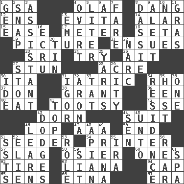 ACROSS 1. Girls' org. (abbr.) 4. Norwegian king 8. Mild oath, euphamism for damn 12. Followers of ems 13. Webber/Rice musical 14. Having or resembling wings 15. Comfort 17. Distance measurement 18. Stalk of a moss capsule 19. Photo 21. Follows as a consequence or result 23. Indian title of respect (Mr.) 24. Attempt 26. Small island 27. Surprise greatly 28. 1/640 square mile 30. Call ___ day 31. Of or pertaining to medicine 34. 17th letter of the Greek alphabet 37. Spanish title 38. Let have 39. Car or cant ending 40. Ingest 41. A girl or young woman (variant) 42. Compass dir. 43. Dormintory (informal) 44. Costume for a special activity 46. Chop off 47. American Automobile Association (abbr.) 50. Conclude 51. Sowing specialist 54. Hard copy producer 57. Volcanic refuse 58. Flexible twig of a willow tree 60. Singles 62. Hoop that covers a wheel 63. Climbing, woody, usually tropical vines 64. Head covering 65. Elected reps. 66. Inactive volcano in Sicily 67. Period DOWN 1. Unit of force equal to gravity 2. Fastener 3. Aide 4. Unconcealed 5. 61 cubic inches 6. Had dinner 7. Conductor's collection 8. Small ungulate mammals of Africa 9. Native American of Southwest Alaska 10. Nathan's nickname 11. Pate de foie ____ 13. Australian flightless bird 16. Shade of tan 20. Shallow baking pan 22. Drug cop 25. Entertaining tales 27. Portico 29. Municipality 30. Binary compound 31. Composer Stravinsky 32. Odor 33. Make lace 34. Home 35. Behest 36. Single 41. Drink excessively 43. Evades 44. Elected rep. 45. To (old English) 46. Memorize 48. Bee-related 49. Sports stadium 51. Fast planes 52. Writer Wiesel 53. Hero or heavy, e.g. 55. Retirement account (abbr.) 56. Located in or toward the back 59. Be seated 61. Health resort