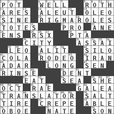 ACROSS 1. Cooking vessel 4. Not ill 8. Writer of Portnoy's Complaint (1969) 12. Ancient Greek god of war 14. Eskimo relative 16. Butter sub 17. Trig term 18. Complicated, petty procedures 20. Hauls 22. Adept person 23. One (Scot) 24. Followers of ems 25. Acura sports coupe 28. Parent Teacher Assoc. 30. Municipality 31. Slender Brazilian palm 35. Lion 37. Came down and settled, as after flight 40. Grain storage tower 41. Root beer relative 42. Cowboy competition 44. SW Asia republic 45. The sixth month of the Jewish calendar 46. Yearn 47. Elected rep. 48. Remove soap 50. Undesirable depression on a surface 52. Ingest 54. Ocean 55. A female animal or person 58. Sep. follower 61. Actress Charlotte 63. An organ shaped like a helmet 65. Interpreter 70. Table seasoning 71. Hoop that covers a wheel 72. Streamer paper 73. Competent 74. Mitch Miller's instrument 75. Nathan's nickname 76. Boy, to dad DOWN 1. Thick mixture 2. Greek mythologigal hunter 3. Portable shelters 4. Armed conflict 5. Connecticut Ivy Leaguer 6. Part of a journey 7. Mass 8. Friend of Pooh 9. Spanish pot 10. Adolescent 11. Stockings 13. Observe 15. Canvas cover 19. Roll call or roster of names 21. Indian title of respect (Mr.) 26. Play the lead 27. Xylene (variant) 29. Aid 30. Rough 32. Father 33. Actor Alda or Thicke 34. Electrically charged atom 35. Farming town in central California 36. Liveliness 38. Wedding promise 39. Watches over 41. Auto 43. Double curve, resembling the letter S 49. Hearing organs 51. Tired old horse 53. Baby powder 55. Thick slices 56. Phone greeting 57. Eroded 58. "Beetle Bailey" pooch 59. Baby bed with high sides 60. Pacific island yam 62. Merit 64. White ___ sheet 66. Born 67. Beverage made from leaves 68. Elect 69. To sift