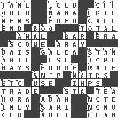 ACROSS 1. Not wild 5. On the rocks 9. Not in operation 12. Wrote a lyric poem 13. Nanny 14. One of the Great Lakes 15. Not women's 16. Flintstone 17. Give a ring to 18. Conclude 19. Oct. 31 cry 21. Add up to 22. Of or related to the anus 24. Long, evenly shaped piece 26. Epoch 27. Biscuitlike quick bread 28. Like ___ of sunshine 29. Raised platform 30. An organ shaped like a helmet 32. Comedian Laurel of Laurel & Hardy 36. Johnson of "Laugh-In" 37. Compass dir. 38. Drink excessively 39. Negative votes 40. Eat (away) 42. Assign a rank or rating to 43. Clip 44. Women servants 46. And so on (abbr.) 49. Purpose 50. Naughty children 51. Buy and sell 53. R.R. building 54. Beverage made from leaves 57. Israeli folk dance 58. First of billions? 61. Observe 62. Inwardly 63. Indian skirt 64. Words to Nanette 65. Corporate head (abbr.) 66. Collude with 67. Liveliness DOWN 1. Heavy book 2. Arabian gulf 3. Ananias' fault 4. Begley and Asner 5. A message received and understood 6. Auto 7. Compass dir. 8. June honoree 9. Declaim 10. Having threads 11. Man or boy (slang) 14. Environmental prefix 19. Prohibit 20. Cassini of fashion 21. Attempt to accomplish something 23. Olfactory organs 24. A special lineage 25. American Automobile Association (abbr.) 27. "Two Mules for Sister ____" 28. Columnist Joseph or Stewart 29. Daniel's nick name 31. Nest on high 32. Long narrow piece of something 33. Inedible or poisonous agaric 34. Tenement units (abbr.) 35. Born 40. Followers of ems 41. Send forth 43. Take to court 45. Nursemaid (var.) 46. Principle of right and wrong 47. Marketplace scale 48. Monte _, Las Vegas Hotel/Casino 52. 24 hours 53. Stricken, poetically 55. Inactive volcano in Sicily 56. A really long time 58. White ___ sheet 59. Apply (a substance) by light strokes 60. "We ___ not amused" (Victoria) 61. Compass dir.
