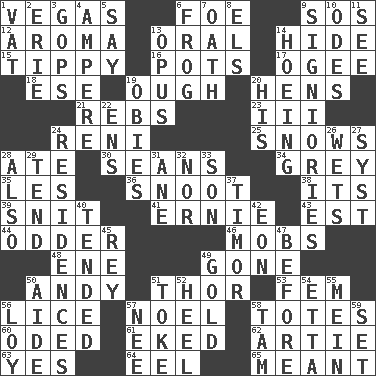 ACROSS 1. Viva Las _ 6. Enemy 9. Distress signal 12. Odor 13. Spoken 14. Flintstone garb 15. Likely to tip or tilt 16. Plant holders 17. Double curve, resembling the letter S 18. Compass dir. 19. Ending for "Through" and "Enough" 20. Coop moms 21. Confederate soldiers (slang) 23. One more than two 24. Painter Guido (1575-1642) 25. Frozen precipitation (plural) 28. Had dinner 30. Seines 34. Jennifer or Joel 35. French article 36. Snob 38. It is 39. In a ____ (agitated or irritated) 41. Bert's buddy 43. Eastern Standard Time (abbr.) 44. More peculiar 46. Disorderly crowds 48. Compass dir. 49. Went 50. Actor Griffith 51. Son of Odin 53. Opposite of masc. 56. Louse (plural) 57. Christmas carol 58. Lugs 60. Wrote a lyric poem 61. Made supply last 62. Nick name for Arthur 63. It is so 64. Snakelike fish 65. Intended DOWN 1. Large container 2. 4th largest of the Great Lakes 3. Republicans 4. Electrical Unit 5. Declare 6. Tree-dwelling hopper 7. Pledge 8. Raised railways 9. Seigniories (variant) 10. Lyric poems 11. Observe 13. Musical composition 14. Weeding 19. Off-Broadway awards 20. Part of HMS, perhaps 22. Followers of ems 24. Homes 26. Moistens 27. System (abbr.) 28. In addition 29. Look after 31. A saturated hydrocarbon 32. Not either 33. Male child 37. The easternmost of the Lesser Sundas 40. Watched over 42. A really long time 45. Marina Del _, California 47. Prior to 49. Gilt 50. Assistant 51. Casino tip 52. Person who is morally reprehensible 54. Singer James 55. Chow _ 56. Myrna of the movies 57. Born 58. Scottish cap 59. Arrange properly for use