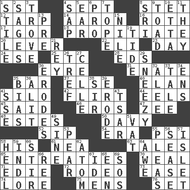 ACROSS 1. Fast jet (abbr.) 4. Back-to-school mo. 8. Proofreading order 12. Canvas cover 14. Composer Copland 16. Writer of Portnoy's Complaint (1969) 17. Russian composer Stravinsky 18. Appease 20. Crowbar 22. Connecticut Ivy Leaguer 23. 24 hours 24. Compass dir. 25. And so on (abbr.) 28. Begley and Asner 30. Jane of fiction 31. Related on the mother's side 35. Oblong piece of solid material 37. Otherwise 40. Liveliness 41. Grain storage tower 42. Seductive woman who exploits men 44. Snakelike fish 45. Expressed in words 46. Greek god of love 47. Last letter of the English alphabet 48. _____ Park, CO 50. American folk hero Crockett 52. Small drink 54. Epoch 55. Air pressure measure (abbr.) 58. Part of HMS, perhaps 61. Teachers' org. 63. Falsehoods 65. Pleas 70. Welt 71. Singer Brickell 72. Cowboy competition 73. Comfort 74. Old wives' tales, e.g. 75. Not women's 76. Put into a specified state DOWN 1. Vertical member of a panel or frame 2. Gurus 3. Collection of objects 4. Plant excrement 5. Hearing organ 6. Adept person 7. Drink excessively 8. Indian title of respect (Mr.) 9. Frog relative 10. Singer James 11. Those things 13. Before (prefix) 15. Mediterranean tributary 19. Periodic rise and fall of the sea level 21. Marina Del _, California 26. Unclean, religiously 27. Cell (Danish) 29. Dwarf with a sinus problem 30. Eats (away) 32. Toward shelter 33. Lie 34. Followers of ems 35. Prejudice 36. Came down and settled, as after flight 38. Title for a knight 39. Eat (away) 41. Compass dir. 43. Russian ruler of old 49. Trig term 51. Large container 53. Lightbulb-shaped fruit 55. Entreaties 56. Gospel singer Marvin 57. Small island 58. Person who is morally reprehensible 59. Southeast Asian peninsula 60. Use a swizzle stick 62. Tiny particle 64. Deep reverence 66. To sift 67. Binary compound 68. Car or cant ending 69. Distress signal