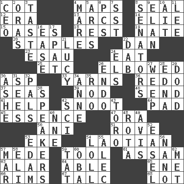 ACROSS 1. Small bed 4. Atlas contents 8. Lick closed 12. Period 13. Arches 14. Writer Wiesel 15. Fertile tracts in a desert 18. Remainder 19. Nathan's nickname 20. Paper fasteners 22. One of the 12 tribes of Israel 23. Son of Isaac 24. Ingest 25. And so on (abbr.) 26. Turned at an angle; bent 30. Cleo's killer 33. Entertaining tales 36. Make new 37. Oceans 39. Allow head to fall sleepily 40. Transmit 41. Aid 42. Snob 44. Writing tablet 45. Center 47. Mouth or opening 50. Cuckoo 51. Be footloose 53. Supplement with great effort 54. Of or relating to Laos or its people 57. Ancient Persian 59. Utensil 61. Indian state 63. Having or resembling wings 64. Competent 65. Compass dir. 66. Basketball hoops 67. Baby powder 68. Car dealer's back yard DOWN 1. Corporate head (abbr.) 2. Mouths or openings 3. Clothes sense 4. Female horse 5. Ancient Greek god of war 6. Personal Computers (abbr.) 7. Fast jet (abbr.) 8. Legislators 9. Enthusiasm 10. Small island 11. Area sheltered from the wind 16. Comfort 17. Argument over a trivial matter 21. "I Love _" 22. Apply (a substance) by light strokes 24. Raised railways 26. Inside; within (prefix) 27. Shed a tear 28. Pulitzer Prize-winning author Ferber 29. Texas town _ City 30. American tennis player Robert 31. Observes 32. Friends 34. Singer Murray 35. Friend of Pooh 38. Orators 42. _-fi 43. "Corrida" creature 46. Compass dir. 48. Round or rotation of duties 49. Opinion 52. Artist's stand 53. Dutch treat 54. Hang loosely or laxly 55. Actor Baldwin 56. Billionth: prefix 57. Spoil 58. Biblical high priest 59. Make lace 60. Chief or king in Benin or Nigeria 62. Was introduced to