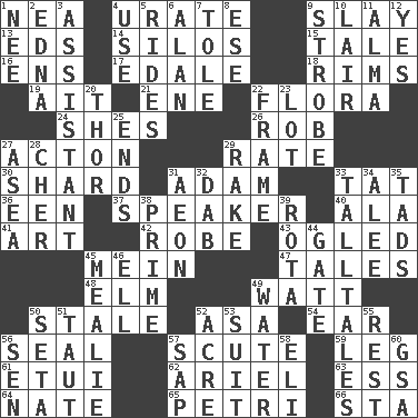 ACROSS 1. Teachers' org. 4. A salt of uric acid 9. Kill 13. Begley and Asner 14. Grain storage towers 15. Falsehood 16. Followers of ems 17. Peak District village in England 18. Basketball hoops 19. Small island 21. Compass dir. 22. Plants 24. "______ My Girl" (Turtles hit) 26. Director Reiner 27. Gambison 29. Pace 30. Broken piece 31. First man 33. Make lace 36. Car or cant ending 37. Orator 40. Chicken ___ king 41. Tate display 42. Loose flowing garment 43. Stared at amorously 45. Count _ (2 wds.) 47. Stories 48. Shade tree 49. Electrical Unit 50. Lacking originality or spontaneity 52. White ___ sheet 54. Ewer handle 56. Lick closed 57. Snake scale 59. Part of a journey 61. Needle holder 62. Satellite of Uranus 63. Curvy letter 64. Nathan's nickname 65. _ dish (used to culture cells) 66. R.R. building DOWN 1. Born 2. Pulitzer Prize-winning author Ferber 3. Aide 4. Purpose 5. Amusement-park features 6. ____ Jay Lerner 7. Lacquered or enameled metalware 8. Compass dir. 9. Disco prop 10. Den 11. _ mater 12. Affirmative reply 20. Son of Odin 22. Movie unit 23. Car dealer's back yard 25. Conclusions 27. Toward the sea 28. "Mermaids" star 29. Libertine 31. Period of immesurable duration 32. Apply (a substance) by light strokes 33. Baron Munchausen's specialties 34. Toward shelter 35. Small boys 38. A-one 39. Round or rotation of duties 44. Yard entry 45. Ear of corn 46. Pipe bend 49. Wetness 50. Bristle 51. Tense 52. 43,560 square feet 53. Set of matching outer garments 55. Relief 56. Elected rep. 57. Plant excrement 58. Connecticut Ivy Leaguer 60. Girls' org. (abbr.)
