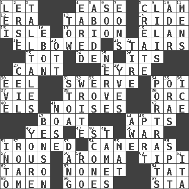 ACROSS 1. Allow 4. Relaxation 8. Dollar (slang) 12. Epoch 13. Off limits 14. Travel on an animal 15. Small island 17. Greek mythologigal hunter 18. Flair 19. Turned at an angle; bent 21. Flight of steps 23. Small child 24. Lair 26. It is 27. Patter 28. Jane of fiction 30. Snakelike fish 31. Turn aside suddenly 34. Luau course 37. Compete 38. Collection of objects 39. The grampus (Milton) 40. Raised railways 41. Annoying sounds 42. Actress Charlotte 43. Water vessel 44. Flats, for short 46. Affirmative reply 47. Eastern Standard Time (abbr.) 50. Armed conflict 51. Pressed 54. Devices for capturing images 57. Horse sense 58. Odor 60. Native american tent (variation) 62. Edible starchy tuberous root 63. Music written for nine 64. Make lace 65. Sign of things to come 66. Moves 67. R.R. building DOWN 1. Flowery wreath 2. Celtic language 3. Baron Munchausen's specialties 4. Having ears or earlike features 5. Stay 6. "Barney Miller" actor Jack 7. Immeasurably long periods of time 8. Make 9. Ms. Damita and namesakes 10. The sixth month of the Jewish calendar 11. Not women's 13. Pull behind 16. Inky black, to poets 20. Baseball player Mel 22. Become fatigued 25. Boldness 27. To provide with a ceiling 29. Jacques Cousteau's middle name 30. First lady 31. Portico 32. Compose 33. Greek goddess of the dawn 34. Likenesses of persons 35. Mouths or openings 36. Frozen water 41. Olfactory organ 43. Gillaume's butler role 44. Deep reverence 45. Role in a play 46. You are 48. Biscuitlike quick bread 49. Softens 51. To the inside or interior of 52. Wander aimlessly 53. Mild oath, euphamism for damn 55. Floor protector 56. Petty quarrel 59. Friend of Pooh 61. Call ___ day