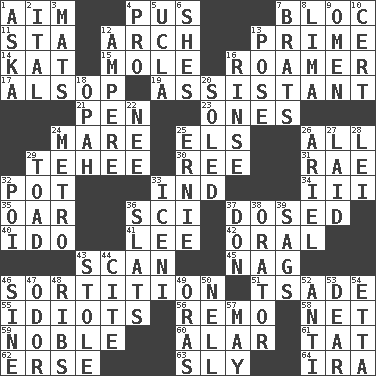 ACROSS 1. Direct toward a target or goal 4. Product of festering 7. Alliance 11. R.R. building 12. Bowlike part 13. A-one 14. Krazy ___ of comics 15. Undercover agent 16. Wanderer 17. Columnist Joseph or Stewart 19. Aide 21. Writing instrument 23. Washington bills 24. Female horse 25. Raised railways 26. 100% 29. Giggle 30. Portuguese money of account (variant) 31. Actress Charlotte 32. Plant holder 33. Working for oneself (abbr.) 34. One more than two 35. Rowing implement 36. _-fi 37. Administered medicine 40. Wedding promise 41. Area sheltered from the wind 42. Spoken 43. Examine hastily 45. Tired old horse 46. Making a chance decision by using lots 51. Sadhe (variant) 55. Foolish or stupid persons 56. San ____ (Riviera town) 58. Fish or hair follower 59. Having high moral qualities 60. Having or resembling wings 61. Make lace 62. Celtic language 63. Stealthy 64. Lyricist Gershwin DOWN 1. "____ silly question..." 2. Slanted text style (abbr.) 3. Floor protectors 4. Adept person 5. Southern CA. univ. 6. "______ My Girl" (Turtles hit) 7. Naughty children 8. Pale green bean 9. Sign of things to come 10. Sure thing 12. Electrical Unit 13. Airs 16. Remove soap 18. Brightly colored fish 20. Having a sole or soles 22. Born 24. Paris' subway 25. Bert's buddy 26. Satellite of Uranus 27. Put down 28. Luau accessory 29. Frog relative 32. Luau course 33. Ancient Celtic tribe of eastern Britain 36. Narrow boards 37. Spanish title 38. Speaker 39. Sinks 43. Fur scarf 44. Quote 46. Trig term 47. Aroma 48. Teases 49. Mouths or openings 50. 1994 drama film starring Jodie Foster 52. Opposed to 53. Letter starter 54. Singer James 57. Fifth month