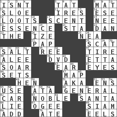 ACROSS 1. Is not 5. Make lace 8. Floor protector 11. _ gin 12. Angers 14. Compass dir. 15. Plunders 17. Odor 18. Born 19. Substance 21. R.R. building 22. One of the 12 tribes of Israel 23. Definite Article 24. Ending with capital 25. Teachers' org. 27. Infant food 28. Jazz singing style 31. Table seasoning 35. To separate or throw off 37. Become fatigued 38. Toward shelter 39. Movie disc 41. Singer James 42. Fly high 43. Hearing organ 45. Sight organs 46. Puts into a specified state 47. Atlas unit 49. Layer 51. Alias (abbr.) 52. Followers of ems 55. Purpose 57. _ moment's notice (2 wds.) 60. Commissioned military rank 62. Auto 63. Impressive in appearance 65. Before Barbara or Clara 66. Whopper 67. Double curve, resembling the letter S 68. Thailand, formerly 69. Say or write further 70. Had dinner 71. Snakelike fish DOWN 1. Small island 2. Agitate, as a liquid 3. Trap for birds or small mammals 4. Wig 5. Nervous spasm 6. Ancient Greek god of war 7. Portable shelter 8. Ananias' fault 9. At sea 10. Adolescent 13. Comedian Laurel of Laurel & Hardy 16. Clip 17. Oozed 20. Russian ruler of old 26. First name in cosmetics 29. Johnson of "Laugh-In" 30. Afternoon social gatherings 31. Backtalk 32. _ vera 33. Tough but pliablecoriaceous 34. Laconic 36. First lady 40. Break 44. Libertine 48. Baking dishes 50. Billionth: prefix 52. Bert's buddy 53. Relating to or accompanying birth 54. Hits or strikes with great force 55. Southern CA. univ. 56. Stated 58. Ancient Roman robe 59. Collude with 61. Relaxation 64. Area sheltered from the wind