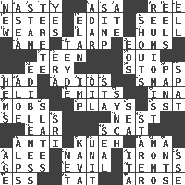ACROSS 1. Difficult 6. White ___ sheet 9. Portuguese money of account (variant) 12. First name in cosmetics 13. Prepare for publication 14. Stitch closed the eyes of (a falcon) 15. Erodes 16. Unable to walk 17. Frame or body of a ship 18. One (Scot) 19. Canvas cover 20. Immeasurably long periods of time 21. Adolescent 23. Fr. "Yes" 24. Suggestive of the supernatural 25. Obstructs or blocks passage 28. Possessed 30. Goodbye (Sp.) 34. Fastener 35. Connecticut Ivy Leaguer 36. Gives off 38. _ tizzy (2 wds.) 39. Disorderly crowds 41. Frolics 43. Fast jet (abbr.) 44. Makes a sale 46. A home for chicks 48. Ewer handle 49. Scram, to a cat 50. Opposed to 51. Malaysian steamed pastry 53. Santa ___, CA 56. Toward shelter 57. Nanny 58. Removes the wrinkles 60. Global Positioning Systems (abbr.) 61. Morally bad or wrong 62. Portable shelters 63. Double-curved letter 64. Make lace 65. Came up DOWN 1. ___ Haven, CT 2. At sea 3. Comedian Laurel of Laurel & Hardy 4. Cigar-shaped 5. Affirmative reply 6. The sixth month of the Jewish calendar 7. Simple or foolish person 8. Had dinner 9. One who advocates reunion 10. Snakelike fish 11. Pipe bend 13. Liveliness 14. Yells 19. Miss Universe 1986, Barbara Palacios _ 20. Greek goddess of the dawn 22. Period 24. The property of being fit to eat 26. Baking dishes 27. Argument over a trivial matter 28. Is hesitant and indecisive 29. Medicinal plant 31. Mischievous child 32. Lubricate 33. R.R. building 37. Synchronize (abbr.) 40. Chalkboards 42. Ocean 45. Indian title of respect (Mr.) 47. A viewer who gazes fixedly 49. Lick closed 50. High mountains 51. Polynesian shrub of the pepper family 52. A single undivided whole 54. Words to Nanette 55. Pismires 56. Personal question 57. Remaining after all deductions 58. Call ___ day 59. Compass dir.