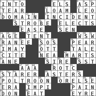 ACROSS 1. To the inside or interior of 5. Raised railways 8. Cleo's killer 11. Rend 12. Rich soil 13. Lion 14. Realm 17. Happening 19. Disco prop 21. Opts 22. Comfort 23. Elected rep. 24. Ripen 27. Portable shelter 29. Compass dir. 32. Indian princess (variant) 34. Distress signal 36. Lightbulb-shaped fruit 37. "If ____ say so..." 38. Baseball player Mel 39. Falsehood 40. Quote 41. Teachers' org. 42. Shops 43. One (Scot) 44. Father 46. Fast jet (abbr.) 47. Auto club (abbr.) 50. College mil. group 52. A viewer who gazes fixedly 55. Michaelmas daisies 57. Characterized by complete cowardliness 59. Threatening words 62. Period 63. Body of Kaffir warriors 64. Ache 65. Spanish title 66. Consume 67. Jane of fiction DOWN 1. It would 2. Modern: prefix 3. Scottish caps 4. Speak pompously 5. Period of immesurable duration 6. Shoestrings 7. Grin 8. Actor Baldwin 9. Emitted 10. Cooking vessels 12. Untruth 15. Feeling or showing extreme anger 16. Characteristic smell of wine 18. Lair 20. Gillaume's butler role 24. N. Chile seaport 25. Homeless child 26. Related on the mother's side 28. Lugs 29. Puts on (as clothing) 30. Table seasonings 31. Take or capture by force 33. Sight organ 35. Flight of steps 36. Parent Teacher Association (abbr.) 42. Distance measurement 45. Printing process, for short 47. Nonscientific branch of learning 48. Nest on high 49. Odor 51. Streamer paper 52. Broke a traffic law 53. "Corrida" creature 54. ____ Jay Lerner 55. Cuckoo 56. Kill 58. Choose 60. Title for a knight 61. Compass dir.
