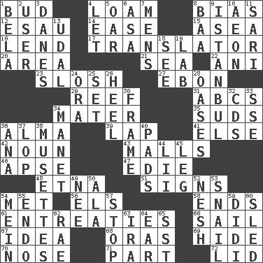 ACROSS 1. Partially opened flower 4. Rich soil 8. Prejudice 12. Son of Isaac 14. Relaxation 15. At sea 16. Grant temporary use of 17. Interpreter 20. Length times width 21. Ocean 22. Cuckoo 23. Splash clumsily 27. Inky black, to poets 29. Coral collection 31. Lettered men learn these first 34. Mother 35. Soap bubbles 36. _ mater 39. Infant locale 41. Otherwise 42. Part of speech 43. Promenades 46. Domed church section 47. Singer Brickell 48. Inactive volcano in Sicily 51. Attaches a signature 54. Was introduced to 56. Raised railways 58. Extremities 61. Pleas 66. Travel by water 67. The main thing one is thinking about 68. Mouths or openings 69. Flintstone garb 70. Characteristic smell of wine 71. Piece 72. Flaplike covering DOWN 1. Actor Lugosi 2. One who makes use of a thing 3. Natives or inhabitants of Denmark 4. Allow 5. Rowing implement 6. White ___ sheet 7. Not women's 8. Sound made by sheep 9. Byzantium, centuries later 10. A really long time 11. Indian skirt 13. Allodial 18. Observe 19. Experiment locale 24. Mouth or opening 25. Put into a specified state 26. Person who is morally reprehensible 28. Fertile tracts in a desert 30. Movie unit 32. Music discs 33. Compass dir. 34. French painter Edouard 36. Santa ___, CA 37. Trim (branches) 38. French bagpipes 40. Writing tablets 44. Cards in a Roman deck? 45. Part of a journey 49. Born 50. According to 52. Delicate 53. Slow-paced one 54. Count _ (2 wds.) 55. Inside; within (prefix) 57. Cease 59. "You Light Up My Life" star Conn 60. Downhill vehicle 62. Actress Charlotte 63. Lyricist Gershwin 64. Hearing organ 65. Fast jet (abbr.)