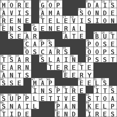 ACROSS 1. Greater amount 5. Republican Party 8. Raised platform 12. Opinion 13. Nanny (var.) 14. Message 15. French philosopher Descartes 16. Household entertainment appliance 19. Followers of ems 20. Commissioned military rank 21. Burn superficially 23. Had dinner 24. Yet 27. Smile enhancers 30. Introduce or present, as a question 31. Motion picture awards 34. I made a mistake 35. Russian ruler of old 38. Killed 40. Inconspicuous attention getter 41. Merit 42. Cylindrical with tapered ends 44. Pismires 45. Suggestive of the supernatural 46. Compass dir. 47. Atlas unit 50. Snakelike fish 53. Heighten or intensify 57. It is 59. Supplying deficiencies 63. Portico 64. Slow-paced one 65. Baking dish 66. Seaweed 67. Periodic rise and fall of the sea level 68. Conclusion 69. Angers DOWN 1. Female horse 2. Baking chambers 3. Wash lightly 4. Compass dir. 5. Yard entry 6. Sign of something about to happen 7. Light colored 8. Two (Sp.) 9. Cuckoo 10. Wedding promise 11. Elected rep. 14. Drop; flow; fall 17. Epoch 18. Large container 20. Pate de foie ____ 22. Oak nuts 24. Expressions of contempt or scorn 25. United States Postal Service (abbr.) 26. Trial 28. Personal Computers (abbr.) 29. Table seasoning 30. Wimpy's pal 32. Actress Charlotte 33. Title for a man of rank and authority 35. Beverages made from leaves 36. Without 37. Johnson of "Laugh-In" 39. Born 43. Family _ (genealogy) 47. Place where flour is made 48. A saturated hydrocarbon 49. Pacific Standard Time (abbr.) 51. 61 cubic inches 52. Took without asking 54. Corncob 55. _ the terrible 56. Tear apart 58. Plant excrements 59. Fast jet (abbr.) 60. University (slang) 61. Groovy apt. 62. Sliced dessert 63. What Jean-Claude Killy likes to do
