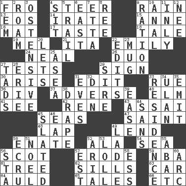 ACROSS 1. Away 4. Bull 9. Water falling in drops from the sky 13. Greek goddess of the dawn 14. Feeling or showing extreme anger 15. Singer Murray 16. Floor protector 17. Clothes sense 18. Story 19. Cartoonist voice _ Blanc 21. Call ___ day 22. Poet Dickinson 24. Anneal 26. Superhero pair 27. Trials 29. Public display of a written message 30. Get up 31. Prepare for publication 33. Regret 36. HTML Container Element 37. Contrary to your interests or welfare 40. Shade tree 41. Observe 42. French philosopher Descartes 43. Slender Brazilian palm 45. Oceans 47. Virtuous person 48. Infant locale 49. Grant temporary use of 50. Related on the mother's side 52. According to 54. Ocean 56. Highlander 57. Wear away 59. Basketball assoc. 61. Family _ (genealogy) 62. Beverly of Met fame 63. Auto 64. Old (Scot.) 65. Stories 66. And so on (abbr.) DOWN 1. Opposite of masc. 2. Wander 3. Clearly or manifestly demonstrative 4. Be seated 5. Hang back 6. 90 degrees 7. Singer James 8. To separate or throw off 9. Food allowance for one day 10. Of or related to the anus 11. In an inward manner 12. Born 20. Allows 22. Proofreads 23. Large cup 25. Toward the sea 27. Bits 28. One of the Great Lakes 29. Male parent of an animal 31. Nights before holidays 32. Lair 33. Home 34. ____ Bator 35. Give off 38. Window treatment 39. Comfort 44. Without 45. Scheduled 46. Ingest 49. Dipping utensil 50. Shade of tan 51. Christmas carol 52. Roberta Peters solo 53. Hang loosely or laxly 55. Blind as ____ 56. R.R. building 57. Eastern Standard Time (abbr.) 58. Double-curved letter 60. Curve