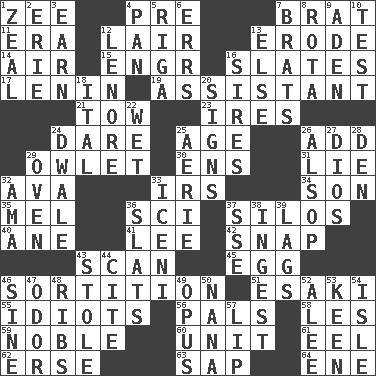 ACROSS 1. Last letter of the English alphabet 4. Before (prefix) 7. Naughty child 11. Period 12. Den 13. Wear away 14. Wind 15. Engineer (abbr.) 16. Chalkboards 17. Soviet premier 1918-24 19. Helper 21. Pull behind 23. Angers 24. Have the gumption 25. Personal question 26. Increase 29. A small or young owl 30. Followers of ems 31. Whopper 32. Actress Gardner 33. Big collection agency 34. Male child 35. Cartoonist voice _ Blanc 36. _-fi 37. Grain storage towers 40. One (Scot) 41. Area sheltered from the wind 42. Fastener 43. Skim 45. Ovum 46. Conclusion 51. 1973 Nobel Price Winner (Physics) Leo 55. Foolish or stupid persons 56. Friends 58. French article 59. Having high moral qualities 60. A single undivided whole 61. Snakelike fish 62. Celtic language 63. Plant excrement 64. Compass dir. DOWN 1. Ardor 2. One of the Great Lakes 3. Merit 4. Baking dish 5. Capital of Latvia 6. Blunders 7. Naughty children 8. Roll call or roster of names 9. Arabian gulf 10. Trial 12. Poe poem 13. Otherwise 16. Begets 18. Slanted text style (abbr.) 20. Attaches a signature 22. Dripping 24. A sleeping potion; an opiate (poet.) 25. Nest on high 26. Columnist Joseph or Stewart 27. "Vaya con ____" 28. Lair 29. Baking chamber 32. Housemaid (var.) 33. Ancient Celtic tribe of eastern Britain 36. Narrow boards 37. Compass dir. 38. Consume 39. Falls behind 43. Took without asking 44. Quote 46. Trig term 47. Aroma 48. Teases 49. Musical composition 50. Nanny 52. Toward shelter 53. Peachy ____! 54. Capri or Wight 57. Mouth edge