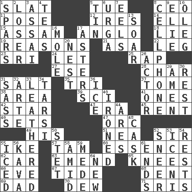 ACROSS 1. Narrow board 5. Third day of the wk. 8. Corporate head (abbr.) 11. Introduce or present, as a question 12. Angers 14. Pipe bend 15. Indian state 17. White American of non-Hispanic descent 18. Untruth 19. Thinks logically 21. White ___ sheet 22. Part of a journey 23. _ Lanka 24. Allow 25. Reproach for some lapse or misdeed 27. Compass dir. 28. Burn to charcoal 31. Table seasoning 35. Three (prefix) 37. Heavy book 38. Length times width 39. _-fi 41. Washington bills 42. Play the lead 43. Epoch 45. Monthly bill 46. Puts into a specified state 47. The grampus (Milton) 49. Part of HMS, perhaps 51. Teachers' org. 52. Title for a knight 55. D.D.E's nickname 57. Scottish cap 60. Core 62. Auto 63. Make improvements or corrections to 65. Leg joints 66. First lady 67. Periodic rise and fall of the sea level 68. Gouge 69. June honoree 70. Morning condensation 71. Indian titles of respect DOWN 1. Practice fights 2. Failure 3. Slender Brazilian palm 4. Afternoon social gatherings 5. Metal container 6. Capital and largest city of Mongolia 7. Snakelike fish 8. Portable communications device 9. Writer Wiesel 10. Cassini of fashion 13. Fly high 16. Undercover agent 17. Michaelmas daisies 20. A home for chicks 26. Thespian 29. So be it 30. Repose 31. Backtalk 32. Johnson of "Laugh-In" 33. Resembling or made to resemble leather 34. Tarsus (plural) 36. Frozen water 40. Pressed 44. Ancient Greek god of war 48. Keg 50. Proofreading order 52. Scornful expression 53. Ancient Celtic tribe of eastern Britain 54. Musical pauses 55. On the rocks 56. Polynesian shrub of the pepper family 58. Among 59. Ancient Persian 61. Conclusions 64. ___ Haven, CT
