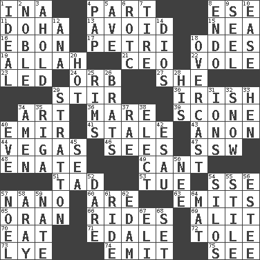 ACROSS 1. _ tizzy (2 wds.) 4. Piece 8. Compass dir. 11. Capital of the state of Qatar 13. Shun 15. Teachers' org. 16. Inky black, to poets 17. _ dish (used to culture cells) 18. Lyric poems 19. Assad's deity 21. Corporate head (abbr.) 22. Short-tailed, large-bodied rat 23. Directed 24. Globe 27. A female animal or person 29. Commotion 30. From or relating to Ireland 34. Tate display 36. Female horse 39. Biscuitlike quick bread 40. Independent ruler or chieftain 41. Lacking originality or spontaneity 43. At once, immediately (arch.) 44. Viva Las _ 46. Observes 47. Compass dir. 48. Related on the mother's side 49. Patter 51. Small boy 53. Third day of the wk. 54. Compass dir. 57. Billionth: prefix 60. "We ___ not amused" (Victoria) 63. Gives off 65. NW Algerian seaport 66. Amusement-park features 69. Set down 70. Consume 71. Peak District village in England 72. Lacquered or enameled metalware 73. Sodium hydroxide 74. Give off 75. Perceive with the eye DOWN 1. Standard of perfection 2. Having high moral qualities 3. Hold, grip (Informal) 4. Infant food 5. "___ Maria" 6. College mil. group 7. Hoop that covers a wheel 8. Inside; within (prefix) 9. Stitch closed the eyes of (a falcon) 10. Comfort 12. Santa ___, CA 14. "Vaya con ____" 18. Cloudy 20. Being at a high temperature 25. Basketball hoops 26. Naughty children 28. Part of HMS, perhaps 29. Ski resort town in Vermont 31. Charged particles 32. Overwhelm 33. Layer 34. So be it 35. Capital of Latvia 37. Actress Charlotte 38. Voters do this 40. First lady 42. Son of Isaac 45. Ocean 50. Born 52. Have the gumption 54. Grain storage towers 55. Vertical member of a panel or frame 56. First name in cosmetics 57. Christmas carol 58. Like ___ of sunshine 59. Nathan's nickname 61. Travel on an animal 62. Dutch treat 64. Floor protector 67. Biblical high priest 68. Arrange properly for use