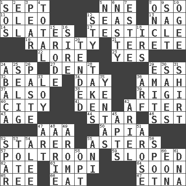 ACROSS 1. Back-to-school mo. 5. Compass dir. 8. Bear (Spanish) 11. Butter sub 12. Oceans 13. Tired old horse 14. Chalkboards 17. One of the two male reproductive glands 19. Noteworthy scarcity 21. Cigar-shaped 22. Old wives' tales, e.g. 23. It is so 24. Cleo's killer 27. Gouge 29. Double-curved letter 32. Memphis, Tenn. Street 34. 24 hours 36. Nanny 37. In addition 38. Make supply last 39. Swiss mountan, "Queen of the Mountains" 40. Municipality 41. Lair 42. Following 43. Grow older 44. Play the lead 46. Fast jet (abbr.) 47. American Automobile Association (abbr.) 50. Capital of Western Samoa 52. A viewer who gazes fixedly 55. Michaelmas daisies 57. Characterized by complete cowardliness 59. Slanted 62. Had dinner 63. Body of Kaffir warriors 64. Within a short period 65. To riddle 66. Ingest 67. Inactive volcano in Sicily DOWN 1. Distress signal 2. Pipe bend 3. Lightbulb-shaped fruit 4. Add up to 5. Born 6. Characterized by obscenity 7. First name in cosmetics 8. At one time in the past 9. Table seasoning 10. Double curve, resembling the letter S 12. Filthy place 15. Eat (away) 16. Father 18. Big collection agency 20. Looked after 24. Phillipine bananalike plant 25. Major League Baseball Commissioner Bud 26. Thick mixture 28. Proceeds 29. Sends forth 30. Gurus 31. Chest covering 33. Myrna of the movies 35. Gossips 36. Sandy's bark 42. Satellite of Uranus 45. Flats, for short 47. Nonscientific branch of learning 48. Nest on high 49. Odor 51. Came up 52. Practice fight 53. Carry 54. Toward shelter 55. Black tropical American cuckoo 56. Specific locale 58. Elect 60. Period of immesurable duration 61. Heredity factor (abbr.)