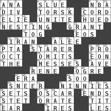 ACROSS 1. Santa ___, CA 4. Turn sharply 8. Basketball assoc. 11. HTML Container Element 12. Cod relative 14. Drawstring 15. Writer Wiesel 17. Join together 18. Took on color 19. Snuggling 21. Let have 23. Coat; cloak 24. Greek goddess of the dawn 25. SW Asia republic 27. Toward shelter 30. Parent Teacher Association (abbr.) 31. A viewer who gazes fixedly 34. Adept person 37. Sep. follower 38. Leaves out 39. Period of immesurable duration 40. Definite Article 41. Makes clutter 43. "___ Maria" 44. French philosopher Descartes 45. Legendary monster 47. Epoch 49. "Barney Miller" actor Jack 50. Scornful expression 52. Simpletons 56. Arranges properly for use 57. Witty Wilde 60. Extremities 61. Proofreading order 62. Speak pompously 63. Teat (slang) 64. Ewer handle 65. Angers 66. French article DOWN 1. An important port of Yemen 2. Mediterranean tributary 3. Opinion 4. Feeling sharp psychological pain 5. Yearn 6. RI univ. 7. Eastern Standard Time (abbr.) 8. Parts of speech 9. Cy Young winner Saberhagen 10. Find the sum of 13. Cask 14. US Secretary of Labor Elaine L. _ 16. Singer James 20. Charged atoms 22. To sift 25. Hankering 26. Pace 27. Get up 28. Allows 29. Celtic language 30. Plant holder 32. Heavy book 33. So be it 34. Lightbulb-shaped fruit 35. Be footloose 36. Single 42. Within a short period 44. Actress Charlotte 46. Went 47. Keyboard key 48. Remainder 49. Begets 50. Stalk of a moss capsule 51. Friend of Pooh 52. Nathan's nickname 53. International (abbr.) 54. Singer Brickell 55. Fast planes 56. Compass dir. 58. Indian title of respect (Mr.) 59. Auto