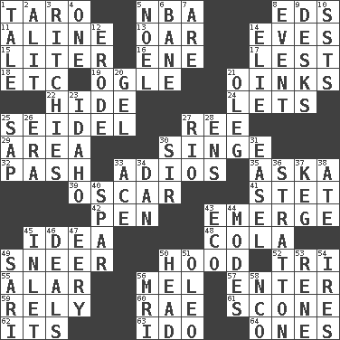 ACROSS 1. Edible starchy tuberous root 5. Basketball assoc. 8. Begley and Asner 11. Place in a line 13. Boat paddle 14. Nights before holidays 15. 61 cubic inches 16. Compass dir. 17. For fear that 18. And so on (abbr.) 19. Stare 21. Pig sounds 22. Flintstone garb 24. Allows 25. A glass for beer 27. To separate or throw off 29. Type of rug 30. Scorch 32. Romantic infatuation 33. Goodbye (Sp.) 35. "____ silly question..." 39. Witty Wilde 41. Proofreading order 42. Fenced enclosure 43. Develop 45. The main thing one is thinking about 48. Root beer relative 49. Scornful expression 50. Parka part 52. Three (prefix) 55. Having or resembling wings 56. Cartoonist voice _ Blanc 57. Keyboard key 59. Have confidence or faith in 60. Actress Charlotte 61. Biscuitlike quick bread 62. ___ a Wonderful Life 63. Wedding promise 64. Washington bills DOWN 1. Story 2. Came down and settled, as after flight 3. Actors Guy, Robert Welles, and Clint 4. Single 5. Christmas carol 6. Object of repulsion 7. "We ___ not amused" (Victoria) 8. Incident 9. Writing tables 10. Fast planes 12. Wear away 14. Writer Wiesel 20. Set 21. Cassini of fashion 23. Potato state 25. Plant excrement 26. Epoch 27. _ de Janeiro 28. Followers of ems 30. Title for a knight 31. Artist's stand 33. Adept person 34. Daniel's nick name 36. Ski resort town in Vermont 37. Barrel 38. Had dinner 40. Coast Guard woman 43. Environmental prefix 44. Methods 45. An arm off of a larger body of water 46. Allots cards 47. Suggestive of the supernatural 49. Indian skirt 50. Froth on beer 51. Butter sub 53. French philosopher Descartes 54. Angers 56. Medical imaging device (abbr.) 58. Non-commissioned officer (abbr.)