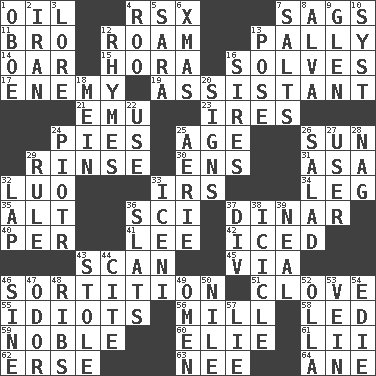 ACROSS 1. Lubricate 4. Acura sports coupe 7. Sinks 11. Sis' sibling 12. Wander aimlessly 13. Chummy 14. Rowing implement 15. Israeli folk dance 16. Finds the solution 17. Foe 19. Helper 21. Australian flightless bird 23. Angers 24. Sliced desserts 25. Mature 26. Player for Phoenix 29. Wash lightly 30. Followers of ems 31. White ___ sheet 32. Nilotic language 33. Big collection agency 34. Part of a journey 35. The first octave above the treble staff 36. _-fi 37. Middle Eastern gold or silver currency 40. For each 41. Area sheltered from the wind 42. On the rocks 43. Glance over 45. By way of 46. Decision 51. Garlic unit 55. Foolish or stupid persons 56. Place where flour is made 58. Directed 59. Having high moral qualities 60. Writer Wiesel 61. Cards in a Roman deck? 62. Celtic language 63. Born 64. A saturated hydrocarbon DOWN 1. Mitch Miller's instrument 2. SW Asia republic 3. Old wives' tales, e.g. 4. Friend of Pooh 5. "Two Mules for Sister ____" 6. Dec. holiday 7. Table seasonings 8. Inventor's middle name 9. Small, secluded valley 10. System (abbr.) 12. Poems 13. Airs 16. Begets 18. Chow _ 20. Attaches a signature 22. Purpose 24. Peter (Polish) 25. Nest on high 26. Vegetable dish 27. One who makes use of a thing 28. Tired old horse 29. General guideline 32. Infant locale 33. Ancient Celtic tribe of eastern Britain 36. Narrow boards 37. HTML Container Element 38. Hanging ice 39. Be tempered by heat 43. Fur scarf 44. Quote 46. Trig term 47. Aroma 48. Chest bones 49. Presage 50. "Death on the ____" 52. Water jar 53. Distinctive style or manner 54. Singer Brickell 57. Falsehood