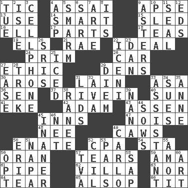 ACROSS 1. Nervous spasm 4. Slender Brazilian palm 9. Domed church section 13. Purpose 14. Don Adams' spy role 15. Downhill vehicle 16. Pipe bend 17. Pieces 18. Afternoon social gatherings 19. Raised railways 21. Actress Charlotte 22. Standard of perfection 24. Demure 26. Auto 27. Value system 29. Lairs 30. Came up 31. (Had) reclined 33. White ___ sheet 36. Elected rep. 37. Popular '50s hangout 40. Player for Phoenix 41. Make supply last 42. First of billions? 43. NE Netherlands city 45. Restaurants 47. Annoying sound 48. Born 49. Crow sounds 50. Related on the mother's side 52. Accounting whiz (abbr.) 54. R.R. building 56. Northwest Algerian city 57. Rends 59. Wet nurse (var.) 61. Corncob 62. Country residence 63. Not either 64. Separate forcefully 65. Columnist Joseph or Stewart 66. Teat (slang) DOWN 1. Third day of the wk. 2. Capri or Wight 3. Portable communications device 4. Cleo's killer 5. Excessive but superficial compliments 6. "Two Mules for Sister ____" 7. Johnson of "Laugh-In" 8. It is 9. Michaelmas daisies 10. Entreaty 11. Lick closed 12. Begley and Asner 20. Indian titles of respect 22. Ancient Celtic tribe of eastern Britain 23. Daniel's nick name 25. On the rocks 27. Relaxation 28. Long journey 29. South Vietnam president (1954) 31. Hats (slang) 32. Actress Gardner 33. Helper 34. Takes to court 35. Queen of England 1702-14 38. Indian princess (variant) 39. Grandmother 44. Sty mamas 45. More empty; more void 46. Fish or hair follower 49. Monte _, Las Vegas Hotel/Casino 50. One of the Great Lakes 51. California wine valley 52. To provide with a ceiling 53. Friends 55. Mine, in Marseilles 56. Elect 57. Federal power corp. 58. Plant excrement 60. Nonscientific branch of learning