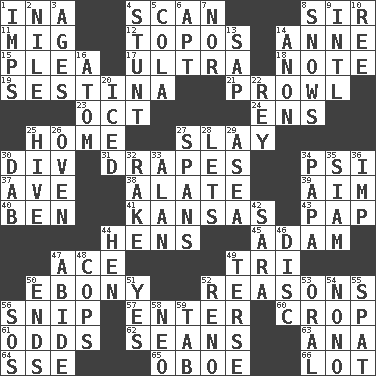 ACROSS 1. _ tizzy (2 wds.) 4. Examine hastily 8. Title for a knight 11. Russian fighter aircraft 12. Literary convention 14. Queen of England 1702-14 15. Entreaty 17. Extremist 18. Make mention of 19. French poetic form 21. Move like a hungry wolf 23. Sep. follower 24. Followers of ems 25. Dwelling 27. Kill 30. HTML Container Element 31. Window treatments 34. 23rd letter of the Greek alphabet 37. "___ Maria" 38. Having winglike extensions 39. Direct toward a target or goal 40. Benjamin's nick name 41. Sunflower state 43. Infant food 44. Coop moms 45. First man 47. Adept person 49. Three (prefix) 50. Black 52. Thinks logically 56. Sever or remove by pinching or nipping 57. Keyboard key 60. Riding implement 61. Likelihood 62. Actors Connery and Penn 63. Santa ___, CA 64. Compass dir. 65. Mitch Miller's instrument 66. Car dealer's back yard DOWN 1. Naughty children 2. Mediterranean tributary 3. Matures 4. Check the growth or development of 5. Root beer relative 6. Fitting 7. Not either 8. Overwhelms 9. International (abbr.) 10. To separate or throw off 13. Plant excrement 14. At once, immediately (arch.) 16. Tiny particle 20. On the rocks 22. Marina Del _, California 25. Hub of activity 26. Baking chamber 27. Connects, as a bridge 28. Allows 29. Toward the sea 30. Small moist lump or mass 32. Immoral or dissolute person 33. Actor Alda or Thicke 34. Dad 35. Thailand, formerly 36. Mischievous child 42. "Two Mules for Sister ____" 44. Layer 46. Compact _ 47. Remain 48. 911 reaches them 49. Laconic 50. Extremities 51. It is so 52. Former U.S. Attorney General Janet 53. Spoken 54. Words to Nanette 55. Petty quarrel 56. Distress signal 58. Modern: prefix 59. Bar bill