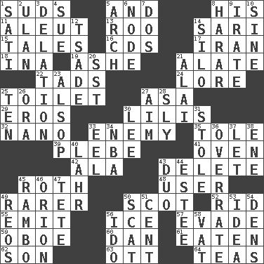 ACROSS 1. Beer foam 5. Added to 8. Part of HMS, perhaps 11. Eskimo relative 13. Friend of Pooh 14. Indian skirt 15. Falsehoods 16. Music discs 17. SW Asia republic 18. _ tizzy (2 wds.) 19. American tennis player Robert 21. Having winglike extensions 22. Bits 24. Old wives' tales, e.g. 25. Bathroom 27. White ___ sheet 29. Greek god of love 30. Ms. Damita and namesakes 32. Billionth: prefix 33. Foe 35. Lacquered or enameled metalware 39. First-year military academy student 41. Baking chamber 42. Insect wing 43. Keyboard key 45. Writer of Portnoy's Complaint (1969) 48. One who uses or employs something 49. More uncommon 50. Native of Scotland 52. To free from 55. Give off 56. Frozen water 57. Dodge 59. Mitch Miller's instrument 60. One of the 12 tribes of Israel 61. Consumed 62. Manchild 63. Baseball player Mel 64. Afternoon social gatherings DOWN 1. Suttee (variant) 2. Uhlan (variant) 3. Accusation by an informer 4. Institute legal proceedings 5. Bowlike part 6. Thickened enlargement 7. Two (Sp.) 8. Ethiopian city, capital of Harari 9. Feeling or showing extreme anger 10. Trig term 12. Sadhe (variant) 14. Grain storage tower 20. Fast jet (abbr.) 21. Jai ____ 23. Columnist Joseph or Stewart 25. Nine, plus one 26. Mouth or opening 27. Direct toward a target or goal 28. Stealthy 30. Area sheltered from the wind 31. Took without asking 33. Snakelike fish 34. Basketball assoc. 36. Make much ado about nothing 37. Allow 38. Compass dir. 40. Cowardly lion portrayer 43. Superhero pair 44. First name in cosmetics 45. Role for Stallone 46. Greek mythologigal hunter 47. False hair 49. Vintage cars 50. Jazz singing style 51. Penny 53. It may be bright or harebrained 54. Cub Scout units 56. Wedding promise 58. Large container