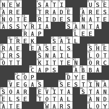 ACROSS 1. ___ Haven, CT 4. Suttee (variant) 8. Purpose 11. "We ___ not amused" (Victoria) 12. Barter 14. Ancient Greek god of war 15. Musical sound 17. Amusement-park features 18. Nathan's nickname 19. Nineveh was its capital 21. Before Barbara or Clara 23. Reproach for some lapse or misdeed 24. Area sheltered from the wind 25. Long journey 27. Move on water 30. Actress Charlotte 31. Artist's stands 34. A female animal or person 37. Big collection agency 38. Slow-paced one 39. Car dealer's back yard 40. Baseball player Mel 41. Baby cat 43. The grampus (Milton) 44. Balmoral and tarboosh 45. Swedish rock group 47. Police officer (slang) 49. Color 50. Viva Las _ 52. French poetic form 56. Fly high 57. Webber/Rice musical 60. Comedian Laurel of Laurel & Hardy 61. Otherwise 62. Add up to 63. Also 64. Had dinner 65. Armed conflicts 66. Myrna of the movies DOWN 1. Nanny 2. Greek god of love 3. Soaks 4. Empty completely 5. Roberta Peters solo 6. Bit 7. Binary compound 8. A salt of uric acid 9. Stalk of a moss capsule 10. Compass dir. 13. Curvy letter 14. Queen of England 1702-14 16. Jane of fiction 20. Libertine 22. 100% 25. Small pie 26. Remainder 27. Theater features 28. Came down and settled, as after flight 29. Small island 30. River (Sp.) 32. "____ silly question..." 33. Sever or remove by pinching or nipping 34. Oscar Madison type 35. Israeli folk dance 36. And so on (abbr.) 42. Negative votes 44. Tax preparer (abbr.) 46. Antes 47. Desist 48. Legendary monster 49. Allots cards 50. Electrical Unit 51. Put into a specified state 52. Play the lead 53. Slanted text style (abbr.) 54. Billionth: prefix 55. "60 Minutes" Commentator Rooney 56. Ocean 58. Promise 59. Call ___ day