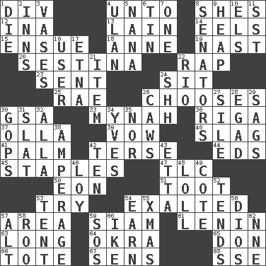 ACROSS 1. HTML Container Element 4. To (old English) 8. "______ My Girl" (Turtles hit) 12. _ tizzy (2 wds.) 13. (Had) reclined 14. Snakelike fish 15. Follow as a consequence or result 18. Singer Murray 19. Political cartoonist Thomas 20. French poetic form 22. Strike 23. Emitted 24. Be seated 25. Actress Charlotte 26. Elects 30. Girls' org. (abbr.) 33. Non-adult bird? 36. Port city in Latvia 37. Water jar 39. Promise 40. Volcanic refuse 41. Inside of hand 42. Laconic 44. Begley and Asner 45. Paper fasteners 47. Affectionate concern, for short 50. A really long time 51. A blast of a horn 53. Attempt 54. Honored 57. Length times width 59. Thailand, formerly 61. Soviet premier 1918-24 63. Having great length 64. Gumbo ingredient 65. Spanish title 66. Carryall 67. Elected reps. 68. Compass dir. DOWN 1. Expire 2. Taverns 3. Flower holders 4. Uhlan (variant) 5. Nanny 6. Shallow baking pan 7. Single 8. Elected representatives 9. Pile 10. Raised railways 11. Fast jet (abbr.) 16. One who uses or employs something 17. Inactive volcano in Sicily 21. A distinct part 22. _ de Janeiro 24. Quiet! 26. Crow sounds 27. Drop; flow; fall 28. Mild oath 29. Droops 30. Republicans 31. Narrow board 32. Silent film actress Nazimova 34. Jacques Cousteau's middle name 35. Not either 38. Electrical Measurement 42. "___ Little Indians" 43. Singer James 46. Myrna of the movies 48. Hang loosely or laxly 49. ____ d'Azur (French Riviera) 52. Is inclined (to) 53. Portable shelter 54. Merit 55. Dec. holiday 56. "Vaya con ____" 57. Keyboard modifier key 58. Friend of Pooh 59. Mayday 60. Mamie's husband 62. Compass dir.