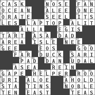 ACROSS 1. Keg 5. Characteristic smell of wine 9. Avid follower 12. Sea 14. Toward shelter 15. Single 16. Declaim 17. Sew up the eyelids of hawks and falcons 18. It is 19. French article 20. Portable computer 23. Set down 24. Silent film actress Nazimova 25. Armor plate that protects the chest 27. Small pie 30. White ___ sheet 32. June honoree 33. Length times width 34. Capri or Wight 36. Born 38. Turn to the right 39. Greek goddess of the dawn 40. Thick or sticky substance 43. At a great distance 46. Evade 48. Indian skirt 49. Writing tablet 51. One of the 12 tribes of Israel 52. Freehold land 53. At sea 54. It's straight from the horse's mouth 56. Open wide 58. Aide 61. Friend of Pooh 64. RI univ. 65. Medicinal plant 66. Hold, grip (Informal) 68. R.R. building 69. Airtight sealed metal containers 70. Impressive in appearance 71. "___ Little Indians" 72. Compass direction 73. Beverages made from leaves DOWN 1. Calm and collected 2. 1/640 square mile 3. Oceans 4. Krazy ___ of comics 5. Political cartoonist Thomas 6. Margarine 7. Oozed 8. Snakelike fish 9. Fencing necessities 10. Opposed to 11. A home for chicks 13. 1994 drama film starring Jodie Foster 21. Mountain range southwest of Kyrgyzstan 22. Went by 23. Helper 24. "One Day ___ Time" 26. Separate the seeds from cotton 27. Label 28. "We ___ not amused" (Victoria) 29. Coral collection 31. Verbally 35. Fortification 37. Mild oath 41. Mouth or opening 42. Lubricate 44. Domed church section 45. Actress Charlotte 47. Leg joint 48. Player for Phoenix 50. Mexican or Central American flower 53. Bee-related 55. SW Asia republic 56. Abrupt rush of wind 57. Johnson of "Laugh-In" 59. Immeasurably long periods of time 60. For fear that 61. Loose flowing garment 62. Rounded earthenware pot or jar 63. Lyric poems 65. Had dinner 67. Being at a high temperature