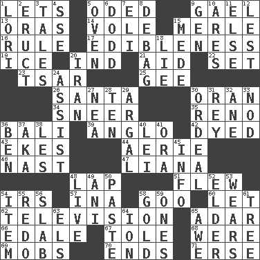 ACROSS 1. Allows 5. Wrote a lyric poem 9. Highlander 13. Mouths or openings 14. Short-tailed, large-bodied rat 15. Haggard of country music 16. Governing power 17. The property of being fit to eat 19. Frozen water 20. Indiana (abbr.) 21. Help 22. Arrange properly for use 23. Russian ruler of old 25. Turn to the right 26. Before Barbara or Clara 30. NW Algerian seaport 34. Scornful expression 35. Former U.S. Attorney General Janet 36. Indonesian resort city 39. White American of non-Hispanic descent 42. Colored 43. Makes supply last 44. Nest on high 46. Political cartoonist Thomas 47. Climbing, woody, usually tropical vines 48. Pet locale 51. Soared 54. Big collection agency 57. _ tizzy (2 wds.) 58. Thick or sticky substance 60. Allow 62. Household entertainment appliance 65. The sixth month of the Jewish calendar 66. Peak District village in England 67. Lacquered or enameled metalware 68. We are 69. Disorderly crowds 70. Conclusions 71. Celtic language DOWN 1. Australian parrot (variant) 2. Spew [out] 3. Falsehoods 4. Compass dir. 5. Baking chamber 6. Texas town _ City 7. Connecticut Ivy Leaguer 8. Debunk (Brit. slang) 9. Commissioned mil. rank 10. Ancient Greek god of war 11. Otherwise 12. For fear that 15. Ancient Persian 18. Falsehood 20. SW Asia republic 24. Aid 27. Teachers' org. 28. "___ Little Indians" 29. Therefore, facetiously 30. Severe or trying experience 31. Marina Del _, California 32. A saturated hydrocarbon 33. Dreamland 36. Benjamin's nick name 37. Alias (abbr.) 38. French article 40. Flowery wreath 41. Mouth or opening 45. A message received and understood 48. Moving, as bait 49. Cuckoo 50. Thick mixture 52. A person who is older than you are 53. Erodes 54. Detail 55. Make new 56. Broad, flat, thick piece 58. Gilded 59. Washington bills 61. Woody plant 63. Raised railways 64. Electrically charged atom 65. Deep reverence