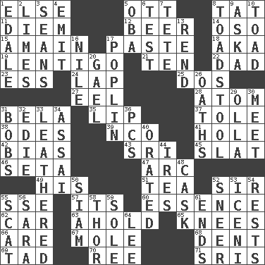 ACROSS 1. Otherwise 5. Baseball player Mel 8. Make lace 11. South Vietnam president (1954) 12. Fermented drink made from hops 14. Bear (Spanish) 15. At full speed 17. Thick mixture 18. Alias (abbr.) 19. Small, flat, pigmented spot on the skin 21. Nine, plus one 22. June honoree 23. Double-curved letter 24. Pet locale 25. Two (Sp.) 27. Snakelike fish 28. Tiny particle 31. Actor Lugosi 35. Mouth edge 37. Lacquered or enameled metalware 38. Lyric poems 39. Non-commissioned officer (abbr.) 41. Hollow 42. Prejudice 43. Indian title of respect (Mr.) 45. Narrow board 46. Stalk of a moss capsule 47. Curve 49. Part of HMS, perhaps 51. Afternoon social gathering 52. Title for a knight 55. Compass dir. 57. It is 60. Substance 62. Automobile 63. Hold, grip (Informal) 65. Leg joints 66. "We ___ not amused" (Victoria) 67. Undercover agent 68. Gouge 69. Bit 70. To sift 71. Indian titles of respect DOWN 1. Peak District village in England 2. Citrus fruits 3. Seines 4. Give off 5. Chief or king in Benin or Nigeria 6. Trial 7. False hair 8. Inedible or poisonous agaric 9. "____ silly question..." 10. Frog relative 13. Tear apart 16. Mediterranean tributary 17. Cotton for raincoats, e.g. 20. Highlander 26. Curses 29. Spanish pot 30. Rendezvous 31. Moves up and down 32. Singer Brickell 33. Tough but pliablecoriaceous 34. Slender Brazilian palm 36. Personal Computers (abbr.) 40. Declaimed 44. Angers 48. Keg 50. Thailand, formerly 52. Contemptuous expression 53. Ancient Celtic tribe of eastern Britain 54. Musical pauses 55. Scram, to a cat 56. "Two Mules for Sister ____" 58. Son of Odin 59. Not divided or shared with others 61. Extremities 64. Area sheltered from the wind