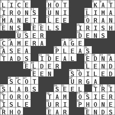 ACROSS 1. Louse (plural) 5. Being at a high temperature 8. Krazy ___ of comics 11. Removes the wrinkles 13. Single; one (prefix) 14. Pale green bean 15. French painter Edouard 16. Area sheltered from the wind 17. NW Algerian seaport 18. Followers of ems 19. Snakelike fish 21. From or relating to Ireland 22. One who uses or employs something 24. Cub Scout units 25. Device for capturing images 27. Grow older 29. Toward the sea 30. Entreaties 32. Small boys 33. Perfect 35. Pulitzer Prize-winning author Ferber 39. A person who is older than you are 41. Grant temporary use of 42. Car or cant ending 43. Dirtied 45. Highlander 48. Capital and largest city of Mongolia 49. Thick slices 50. Sew up the eyelids of hawks and falcons 52. Three (prefix) 55. "Corrida" creature 56. Scottish cap 57. Flexible twig of a willow tree 59. Capri or Wight 60. RI univ. 61. Give a jingle 62. 17th letter of the Greek alphabet 63. Ewer handle 64. Extremities DOWN 1. Citrus frut 2. SW Asia republic 3. Eaten 4. Compass dir. 5. Frame or body of a ship 6. Washington bills 7. Standoff 8. Japanese brewing company 9. Collect or gather 10. Hyperbolic tangent 12. Guide 14. Old wives' tales, e.g. 20. Epoch 21. The main thing one is thinking about 23. Gospel singer Marvin 25. Feline 26. White ___ sheet 27. In the manner of 28. Set 30. For each 31. Major League Baseball Commissioner Bud 33. Binary compound 34. Lair 36. Accusation by an informer 37. Compass dir. 38. Find the sum of 40. Allows 43. Take to court 44. Lowest deck of a ship 45. Make a splashing sound 46. Monte _, Las Vegas Hotel/Casino 47. Mitch Miller's instrument 49. Commotion 50. "Two Mules for Sister ____" 51. Independent ruler or chieftain 53. Tear apart 54. Angers 56. Third day of the wk. 58. A female animal or person