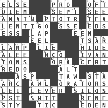 ACROSS 1. Otherwise 5. Adept person 8. Often (poetically) 11. South Vietnam president (1954) 12. Back-to-school mo. 14. Observe 15. With great haste 17. Peter (Polish) 18. Beverage made from leaves 19. Small, flat, pigmented spot on the skin 21. Compass dir. 22. Begley and Asner 23. Double-curved letter 24. Pet locale 25. Car or cant ending 27. Snakelike fish 28. Russian ruler of old 31. Desk light 35. Untruth 37. Flintstone garb 38. Toward shelter 39. Non-commissioned officer (abbr.) 41. _ the terrible 42. Charged particles 43. Mouth or opening 45. Foregone conclusion 46. Do over again 47. Keyboard modifier key 49. Cleo's killer 51. The 23rd letter of the Hebrew alphabet 52. R.R. building 55. Curve 57. Leather borer 60. Speakers 62. Flowery wreath 63. Prying instrument 65. Grain storage towers 66. Pacific Standard Time (abbr.) 67. In a ____ (agitated or irritated) 68. French philosopher Descartes 69. Filthy place 70. Nervous spasm 71. Locale of original sin DOWN 1. Peak District village in England 2. Citrus fruits 3. Actors Connery and Penn 4. Send forth 5. Air pressure measure (abbr.) 6. Vintage cars 7. Chooses 8. Clearly or manifestly demonstrative 9. Nourish 10. Afternoon social gatherings 13. Relationship diagram 16. The longest river in the world 17. Cotton for raincoats, e.g. 20. Highlander 26. Moral principle 29. The sixth month of the Jewish calendar 30. Monthly bill 31. Den 32. Medicinal plant 33. Ananias' fault 34. Mexican monetary units 36. Environmental prefix 40. Speaker 44. Having or resembling wings 48. It was, poetically 50. Friends 52. Having a sole or soles 53. Marketplace scale 54. NE Netherlands city 55. High mountains 56. Remainder 58. Left 59. 57 in ancient Rome 61. Become fatigued 64. And so on (abbr.)