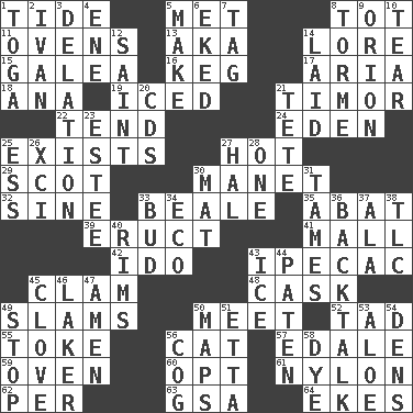 ACROSS 1. Event that recurs at intervals 5. Was introduced to 8. Small child 11. Baking chambers 13. Alias (abbr.) 14. Old wives' tales, e.g. 15. An organ shaped like a helmet 16. Cask 17. Roberta Peters solo 18. Santa ___, CA 19. On the rocks 21. The easternmost of the Lesser Sundas 22. Watch over 24. Paradise 25. Is 27. Being at a high temperature 29. Highlander 30. French painter Edouard 32. Trig term 33. Calif. Air Force Base 35. Blind as ____ 39. Spew [out] 41. Promenade 42. Wedding promise 43. Medicinal drug used to evoke vomiting 45. Dollar (slang) 48. Keg 49. Shuts with force 50. Confront 52. Small boy 55. Casino tip 56. Feline 57. Peak District village in England 59. Baking chamber 60. Elect 61. Thermoplastic polyamide 62. For each 63. Girls' org. (abbr.) 64. Supplements with great effort DOWN 1. Ancient Roman robe 2. "Terrible" tsar 3. Accusation by an informer 4. Compass dir. 5. Cause to be 6. Made supply last 7. Label 8. Singer Mel 9. Constellation of myth 10. Pull apart 12. Virtuous person 14. Put down 20. Music discs 21. False hair 23. First name in cosmetics 25. Curvy letter 26. One more than ninety 27. Actor Linden 28. Single 30. Floor protector 31. Corrects by punishment or discipline 33. Partially opened flower 34. Environmental prefix 36. Sass 37. Chicken ___ king 38. Affectionate concern, for short 40. Basketball hoops 43. Frozen water 44. Eucharist need 45. Garlic unit 46. Member of a famous L.A. basketball team 47. So be it 49. Halt 50. Atlas contents 51. Singer James 53. _ vera 54. Habitations of wild animals 56. Gear tooth 58. Color