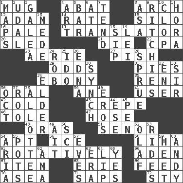 ACROSS 1. Java container 4. Blind as ____ 8. Bowlike part 12. First of billions? 14. Assign a rank or rating to 15. Grain storage tower 16. Light colored 17. Interpreter 20. Downhill vehicle 21. Expire 22. Numbers guy (abbr.) 23. Nest on high 27. Expression of disdain 29. Likelihood 31. Sliced desserts 34. Dark wood 35. Painter Guido (1575-1642) 36. Spoken 39. One (Scot) 41. One who uses or employs something 42. Having a low temperature 43. Streamer paper 46. Lacquered or enameled metalware 47. Stockings 48. Mouths or openings 51. Sir (Sp.) 54. Fitting 56. Frozen water 58. Pale green bean 61. Happening in regular succession 66. An important port of Yemen 67. A whole individual unit 68. 4th largest of the Great Lakes 69. Nourish 70. Toward the sea 71. Plant excrements 72. Filthy place DOWN 1. Atlas contents 2. Hereditary estate 3. An organ shaped like a helmet 4. Nonscientific branch of learning 5. Tavern 6. "One Day ___ Time" 7. Look after 8. White ___ sheet 9. Actors Guy, Robert Welles, and Clint 10. Hoof sound 11. Israeli folk dance 13. Ancient Persian 18. Small drink 19. Flowery wreath 24. Director Reiner 25. Wedding promise 26. Pulitzer Prize-winning author Ferber 28. Upset 30. Synchronize (abbr.) 32. Compass dir. 33. Title for a knight 34. A person who is older than you are 36. Sep. follower 37. Friend of Pooh 38. One to whom something is allotted 40. Greek god of love 44. Compass dir. 45. Animal enclosure 49. Small island 50. _-fi 52. Norwegian king 53. Amusement-park features 54. Roberta Peters solo 55. Plant holders 57. Nights before holidays 59. Confront 60. Actor Griffith 62. Housemaid (var.) 63. Period 64. Mouth edge 65. It is so