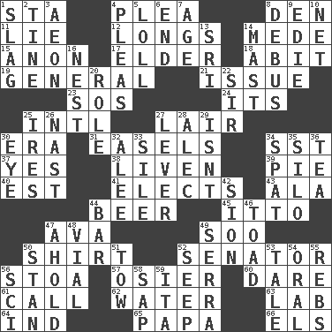 ACROSS 1. R.R. building 4. Entreaty 8. Lair 11. Whopper 12. Yearns 14. Ancient Persian 15. At once, immediately (arch.) 17. A person who is older than you are 18. "This won't hurt ____!" 19. Commissioned military rank 21. Come out of 23. Distress signal 24. It is 25. International (abbr.) 27. Den 30. Period 31. Artist's stands 34. Fast jet (abbr.) 37. Affirmative reply 38. Make or become more lively 39. Sliced dessert 40. Eastern Standard Time (abbr.) 41. Opts 43. Wing 44. Fermented drink made from hops 45. "Tell ____ the Marines!" 47. Actress Gardner 49. "Barney Miller" actor Jack 50. Upper-body garment 52. Elected representative 56. Portico 57. Flexible twig of a willow tree 60. Have the gumption 61. Give a ring to 62. Wetness 63. Experiment locale 64. Working for oneself (abbr.) 65. Dad 66. Raised railways DOWN 1. Volcanic refuse 2. Prong on a fork 3. A really long time 4. Entreaties 5. Hang loosely or laxly 6. Conclusion 7. Personal question 8. To get out of a bus 9. Singer Brickell 10. Remaining after all deductions 13. Indian title of respect (Mr.) 14. Vertical spar for supporting sails 16. A home for chicks 20. Hero or heavy, e.g. 22. Title for a knight 25. Angers 26. Political cartoonist Thomas 27. Prying instrument 28. Actor Baldwin 29. Is not 30. Sight organ 32. Toward shelter 33. Drop; flow; fall 34. Petty quarrel 35. Grain storage tower 36. Beverage made from leaves 42. The Jewish people; Israel 44. Oblong piece of solid material 46. Frog relative 47. Hold, grip (Informal) 48. Small bottle 49. Spanish missionary in California 50. Comedian Laurel of Laurel & Hardy 51. Pull behind 52. Ooze 53. Lie 54. Of the mouth 55. Confederate soldiers (slang) 56. _-fi 58. Plant excrement 59. Call ___ day